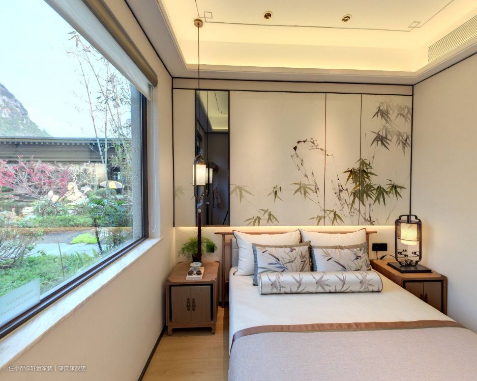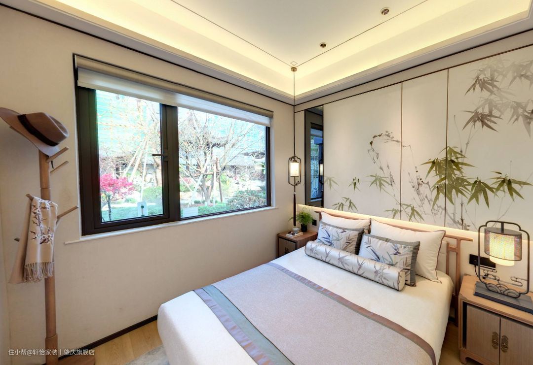 老人房进门就是一个矮柜,这样既满足空间的收纳,也方便老人的进出使用。空间同样延续了原木风,质感满满的,给老人营造一个温情惬意的睡眠空间。 老人房的大窗户设计,有利空间的通风透气和采光,同样也有利于老人的身心健康。床尾衣架设计,方便老人日常挂取服饰、帽子等物件。 床上抱枕的竹子式样和床头背景墙上的竹子墙纸相呼应,凸显出老人的品格与品味。床头两侧安放的床头柜,方便老人摆放水杯、老花镜等物,同时床头灯的设计,方便老人起夜照明。