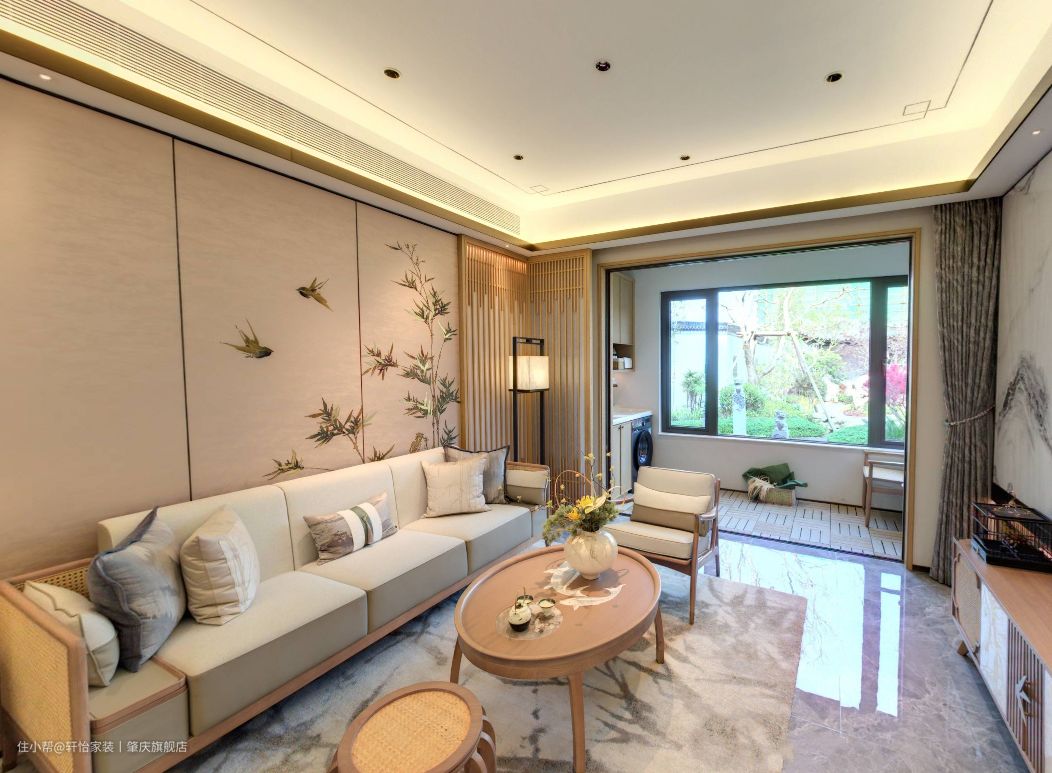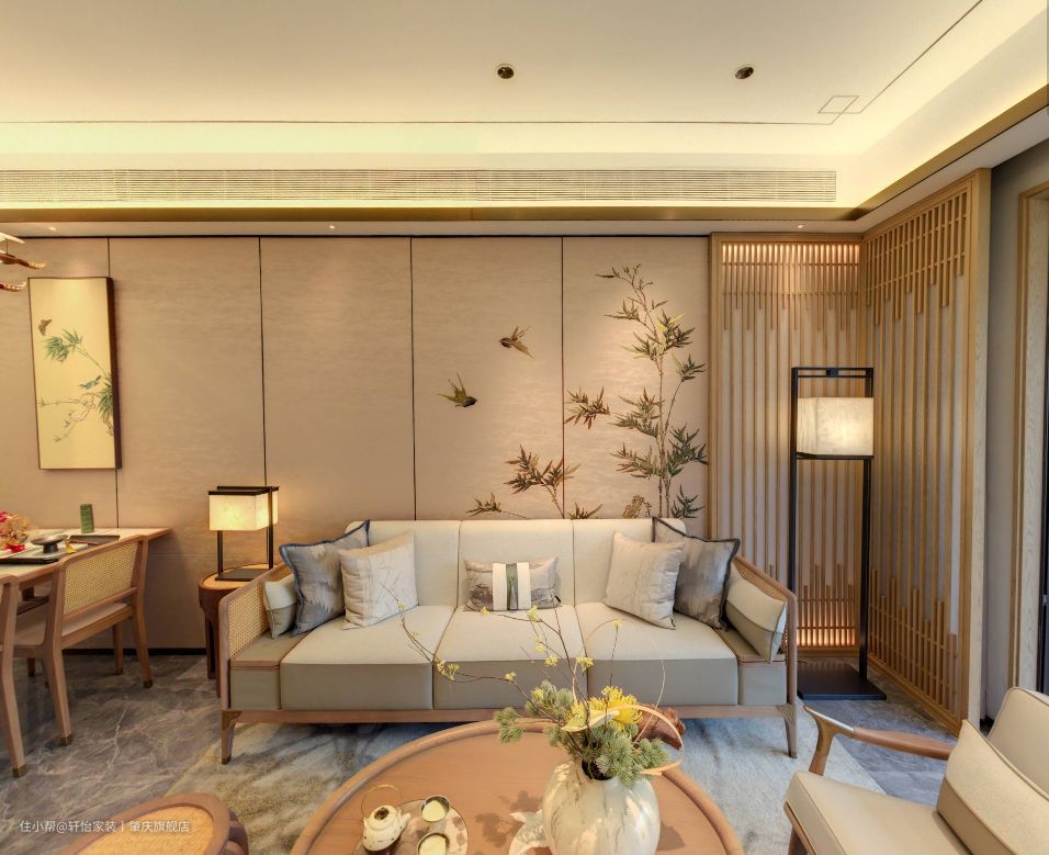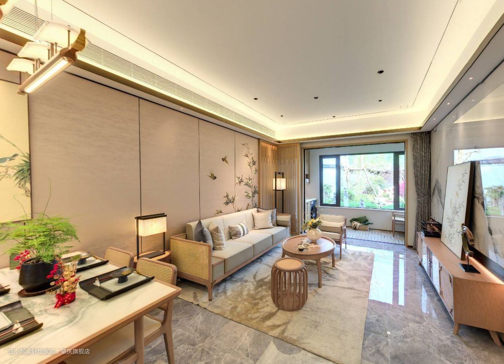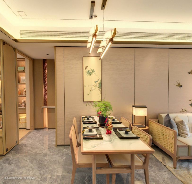 客餐厅一体化设计,不仅保证了空间和视觉的和谐统一,还让家居空间的设计了更连贯,视野更开阔。空间家具的原木风格,让客厅多了一抹素雅的既视感,地面通铺灰色的亮面瓷砖,让空间更敞亮,并有轻奢的质感。 空间无主灯设计,视觉上减少了阻碍,整体看起来更通透,同时筒灯+灯带设计,让空间的光源有了层次感,营造氛围舒适的居住空间。 客厅一字型的木架+布艺搭配的沙发,增加空间的温馨感,在搭配木质的茶几和圆凳,给人带来自然淡雅的视觉效果,沙发背景墙上张贴的竹子墙纸,让整体空间营造出一种宁静致远的感觉来。 客厅做了去电视化设计,一字型的古韵电视柜摆放在那,不仅增加空间的收纳,水墨画的大理石电视背景墙,更是提升空间高级感的绝佳点缀。