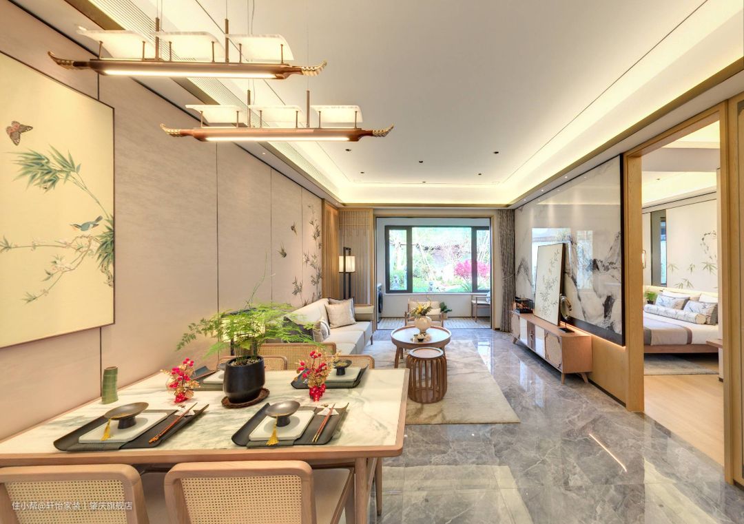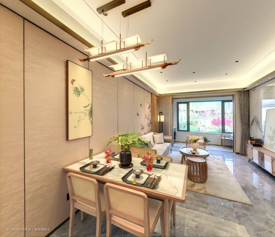 客餐一体化,餐厅空间开阔,活动空间也宽松。餐桌用大理石+木质框架来打造的长方形餐桌,颜值高,档次高,还防水防潮不怕高温,用鲜花绿植点缀一下,放在空间里很和谐。 4人位的餐桌,满足业主家人的日常用餐需求,往外一拉可以秒变6人位的餐桌,方便业主招呼亲朋好友。同时还可以做茶桌使用哦,女业主穿汉服在这拍照,出片率也是杠杠滴。 餐桌上的古风造型灯具,增加空间的雅致感,让整体空间更有档次,还展现出业主的品味来。