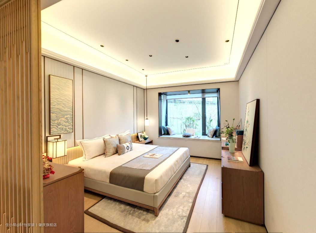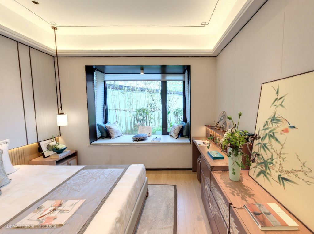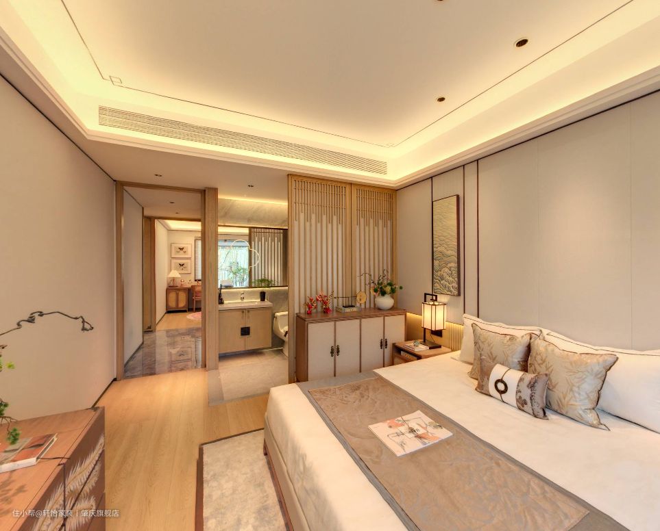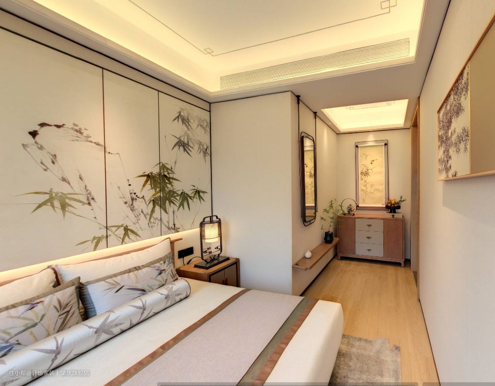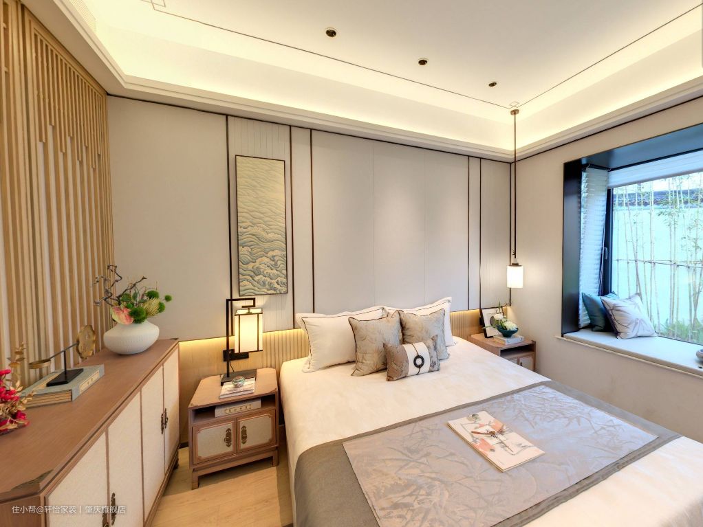 主卧同样也延续了新中式风的腔调,原木的质感搭配浅色的棉纺织品,空间的温馨感就出来了。主卧的无主灯设计,让空间更简洁,视觉感更好。 素雅的床头背景,端庄大气的床头柜、边柜搭配灰色的抱枕、白色的床品,呈现出优雅祥宁的特色,山水挂画+中式元素的吊灯给人带来古典优雅的视觉效果,打造出一个宁静惬意的睡眠空间来。 主卧空间无衣柜设计,用矮柜代替衣柜,达到以少胜多、以简胜繁的效果,营造出富有新中式风格的浪漫情调的睡眠空间。在柜子上方再摆放装饰画或者是花瓶之类的物品,一股子禅意和淡雅就扑面而来。