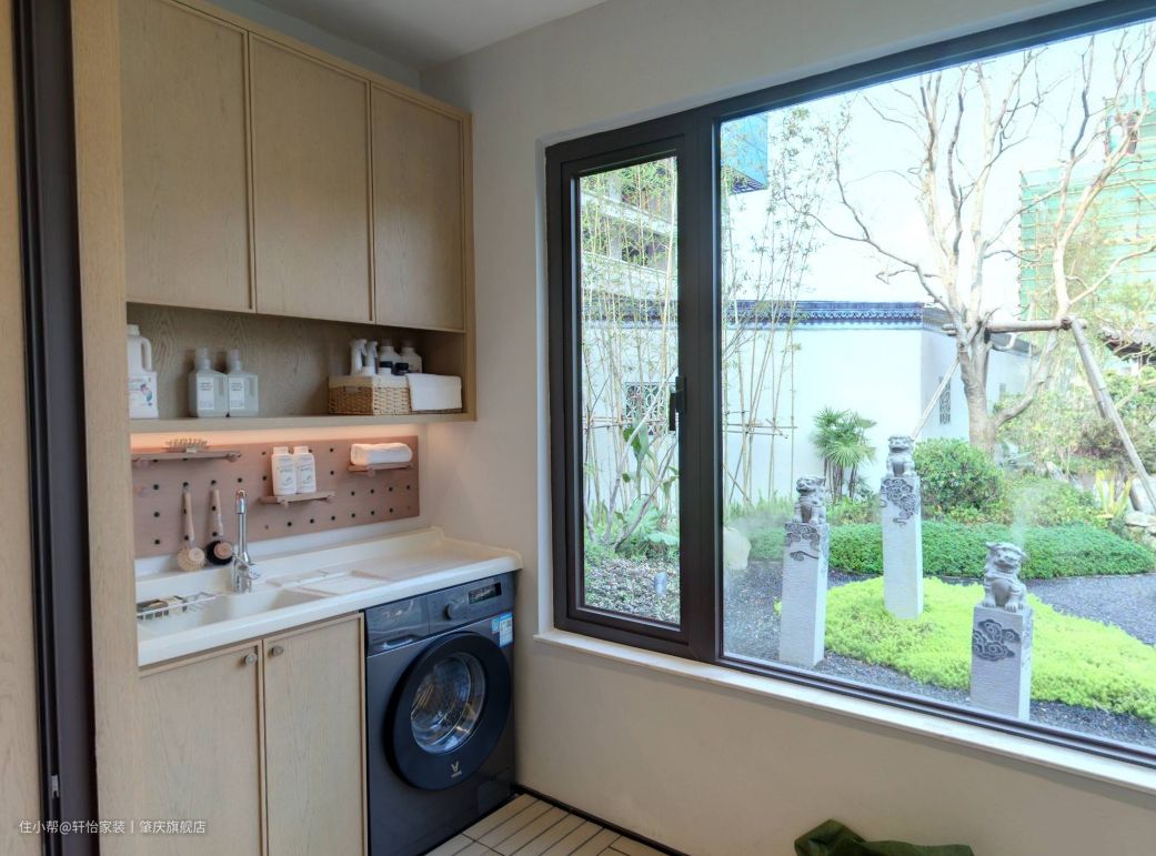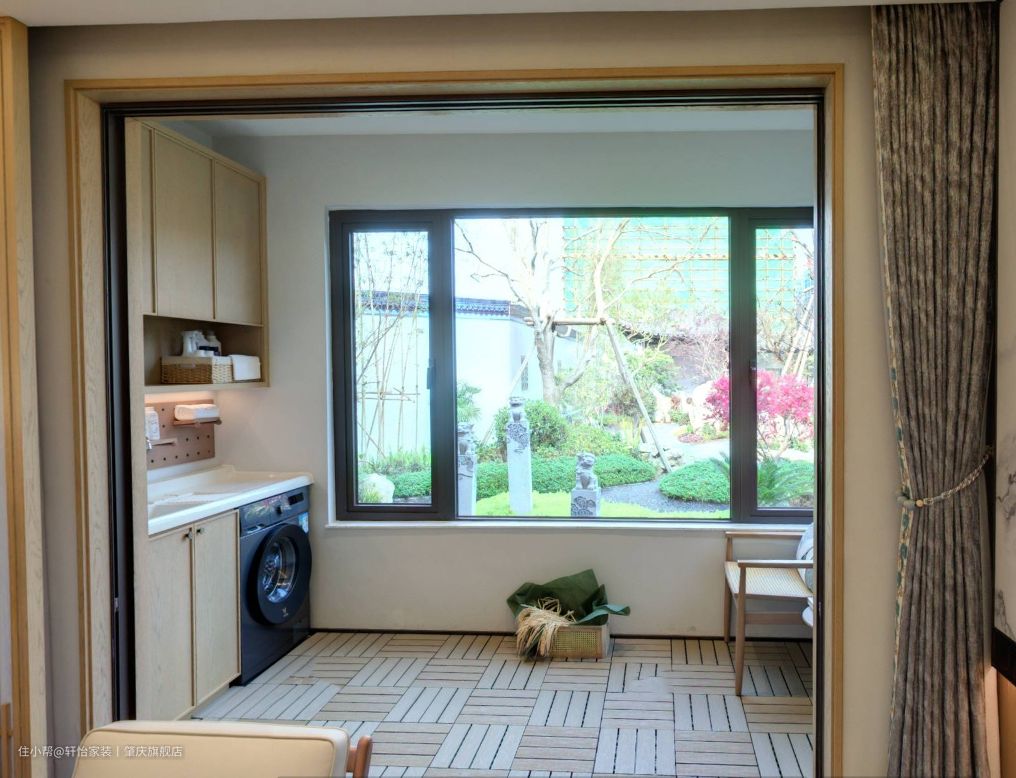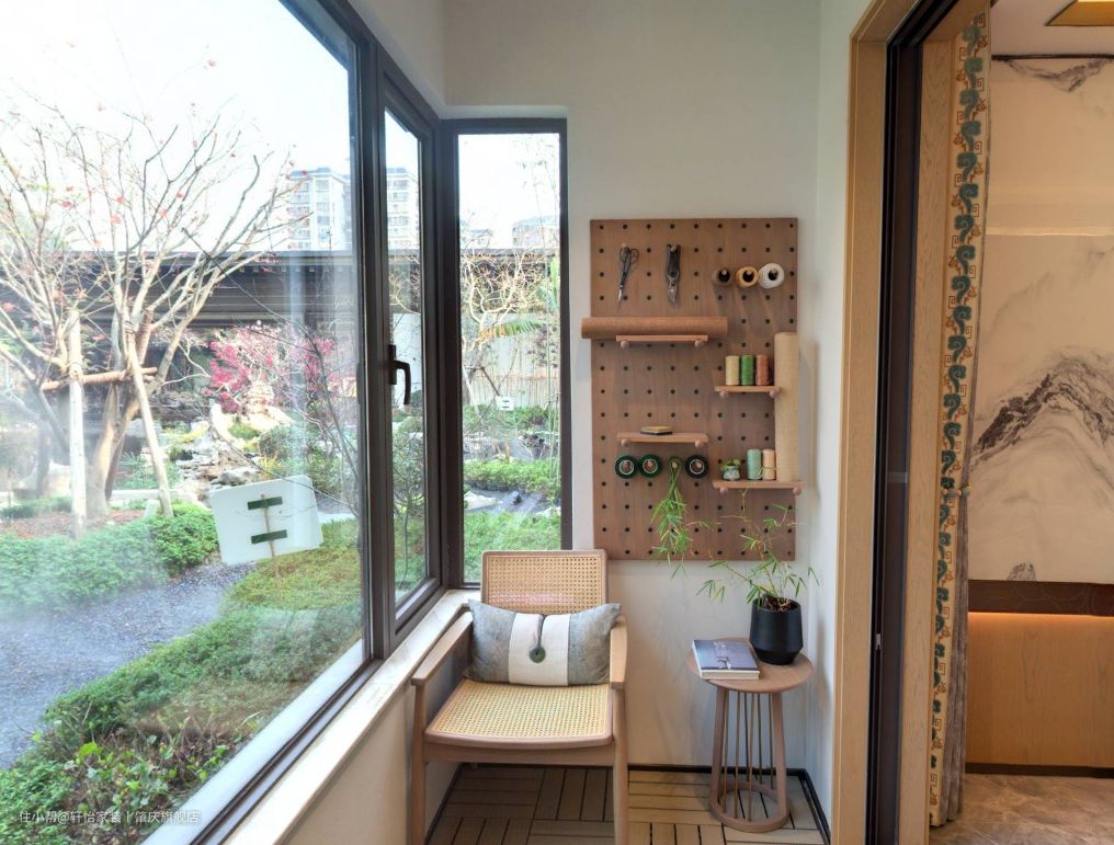 因为房子是在一楼,阳台窗户做了封闭式设计。阳台地板用实木地板,与整屋的中式原木元素相呼应,同时还防滑防腐有质感。 在阳台的右侧做了生活阳台,顶天立地的阳台柜设计,提升全屋空间的收纳能力,吊柜下的展示柜设计,方便业主摆放日常用的清洁用品。中间洞洞板设计,则是方便业主灵活置物,地柜做了收纳柜和安置了洗衣机,方便业主和家人的日常生活,上方做了洗衣台,方便业主清洗衣物等。 阳台的右侧做了休闲阳台,摆放一张单椅和小茶几,在这里便可以坐一个下午,在这里看看书或者是做下手工活,都是个不错的选择,而窗外满庭的花花草草,都为这个家增添了不少颜色。考虑到女业主是个汉服博主,在小茶几上方做了洞洞板设计,方便业主摆放针线等工具。
