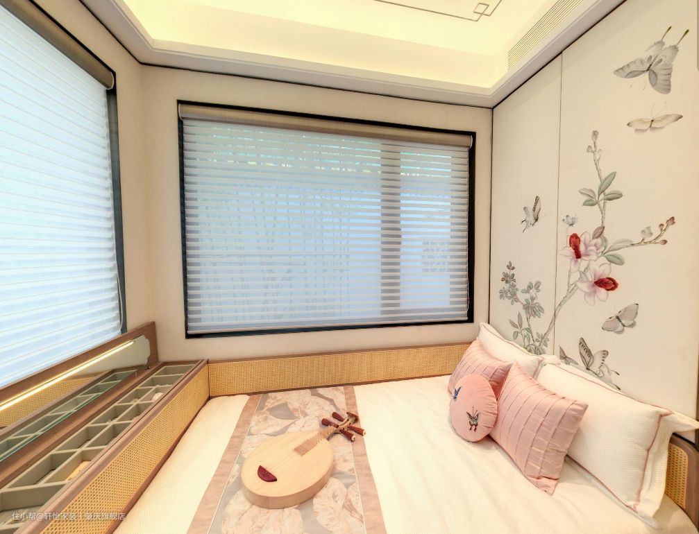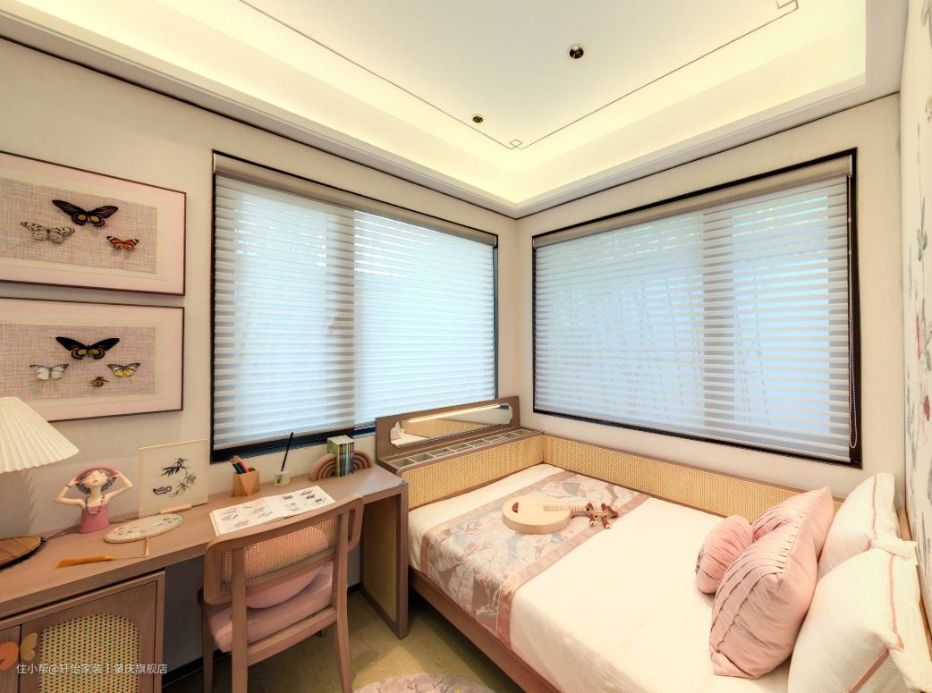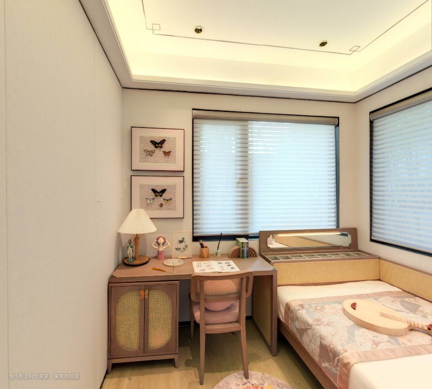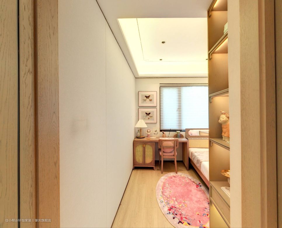 女儿房同样也延续原木元素,在个别软式上增加了粉色的点缀,打造一个温馨又有趣味的女孩房。在女儿房进门的右侧打造了一个展示柜,不但方便孩子摆放自己喜欢的小物件,还能培养孩子的收纳能力。 考虑到孩子正在上学阶段,便把卧室和书房合二为一,方便孩子的日后学习,原木的书桌椅子,质感满满,藤编的书桌柜,让空间多了一抹自然的风采,同时还在书桌上方挂一些蝴蝶的标本,既能做装饰又能培养孩子的兴趣。 床尾处做了多宝格收纳盒,方便孩子收藏自己喜好的小物件,而多宝格上方做了镜子设计,这样方便培养孩子的审美能力。 女儿房里白色的床上床上四件套再点缀粉色的软式小元素,让空间有了公主房的味道,并且在床头上缝插针设计了衣柜,方便孩子的日常穿衣,也合适她现阶段身高的使用。 同时女儿房无主灯设计,不容易对视觉造成损伤,灯带+筒灯设计,分散灯光的布局,营造安全又明亮的睡眠学习氛围。