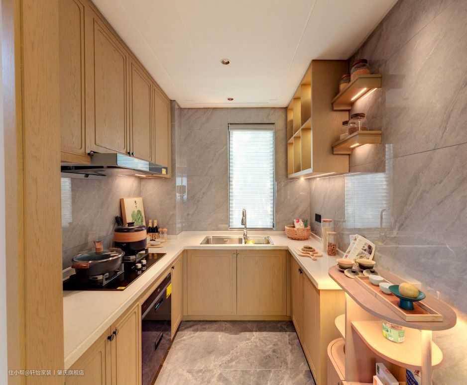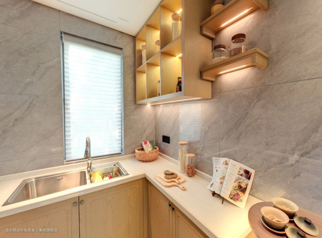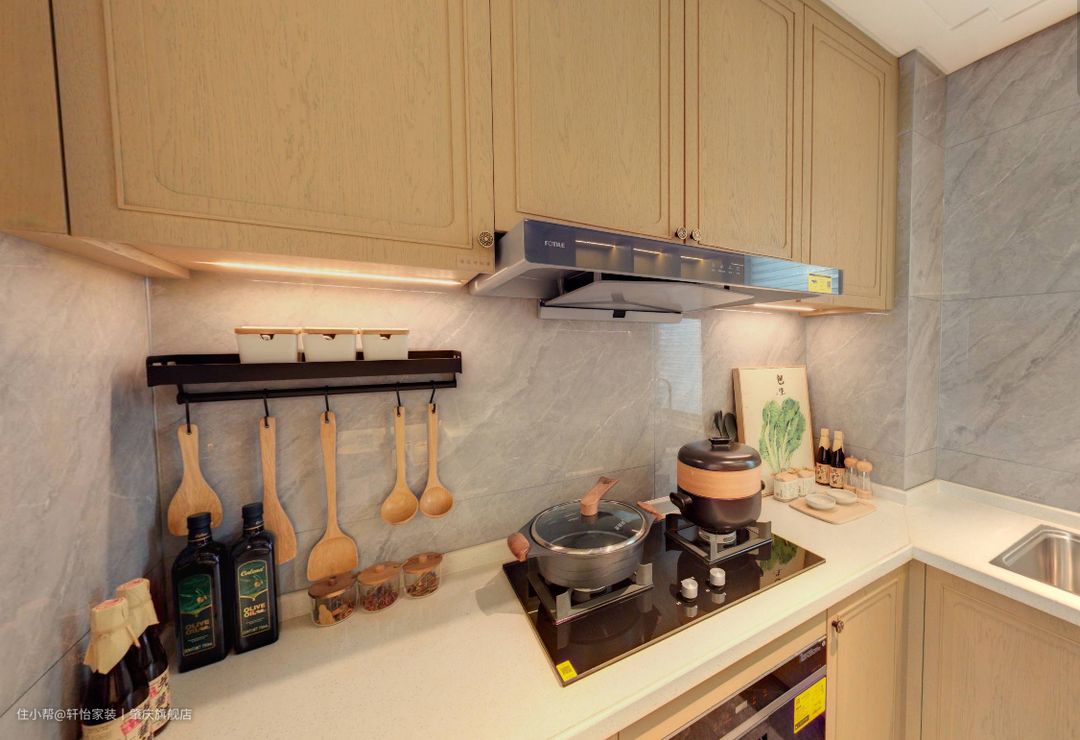 U型厨房的布局,让烹饪区、清洗区、切菜区、收纳区、冷藏区等区域划分明确,厨房功能齐全,收纳容量也更大了。同时U型厨房,操作动线流畅,空间面积大,可容纳多人操作,很适合三代同堂家庭的选择。 厨房双灶台的设计,满足业主一家人的做饭需求,在右侧的墙上做了收纳架,方便业主挂勺子和摆放调料等物品。 在清洗区做在厨房窗户的方位,通风透气,同时还采光方便,让业主在清洗的时候看得更清楚,而且还能愉悦心情。
