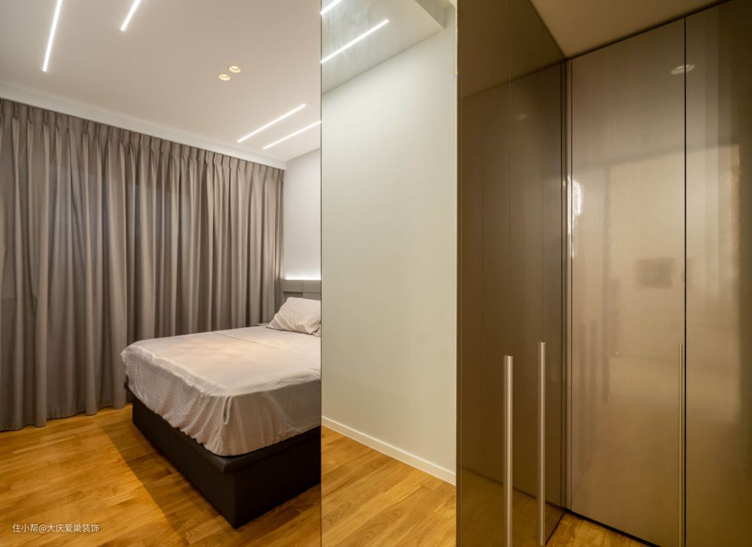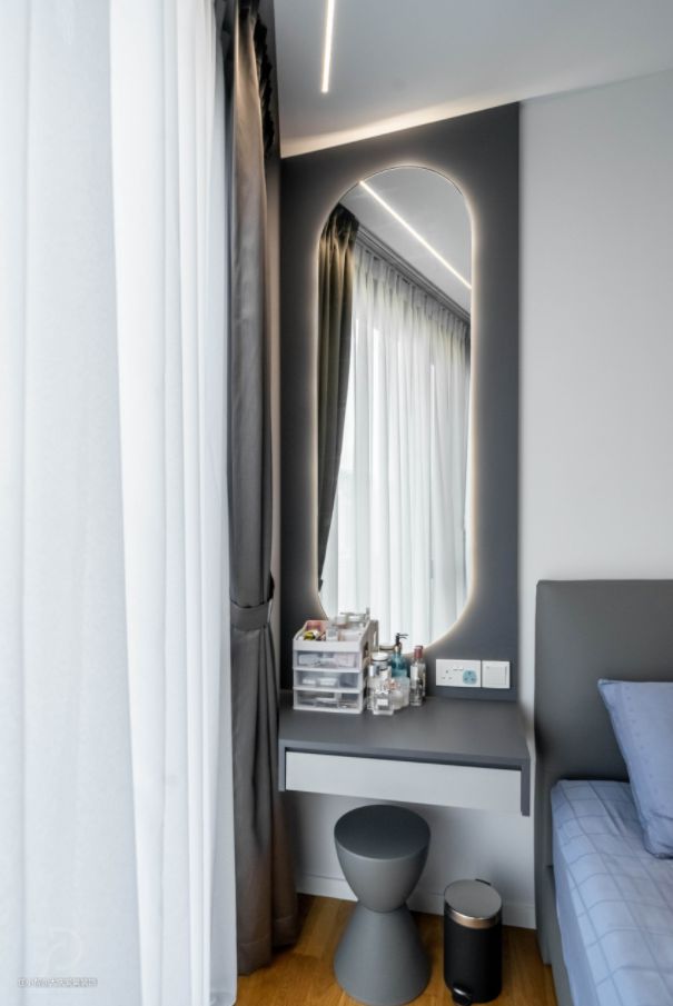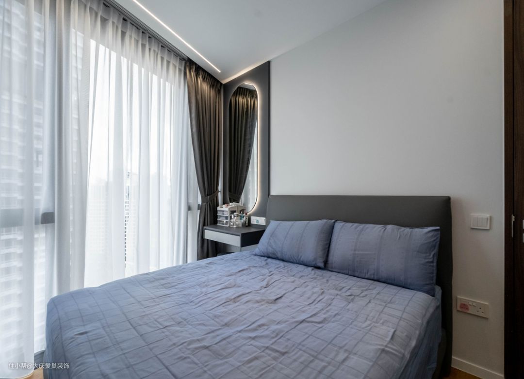 次卧以灰蓝色调装饰为主,在靠窗面我们做了一个小型的梳妆台,由于宽度较小,我们将定制的镜子直接延伸到天花处,纵向贯穿,更显大气。
