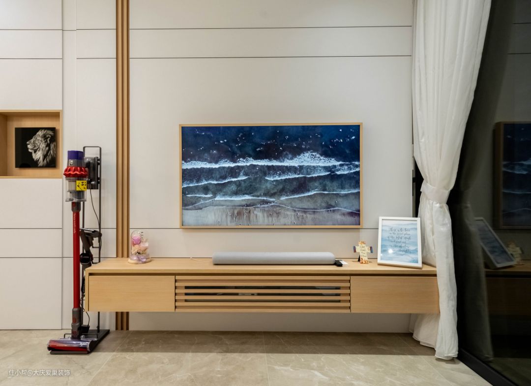 软装方面,米白色的绒面沙发增加柔软质感,在墙面和电视柜方面,多采用原木材质统一色彩,电视我们也是特意选择的这款木质边框的壁画电视,超薄的机身搭配木质边框的设计,看上去就像一幅壁画,颜值出众。