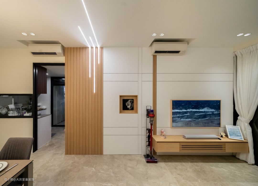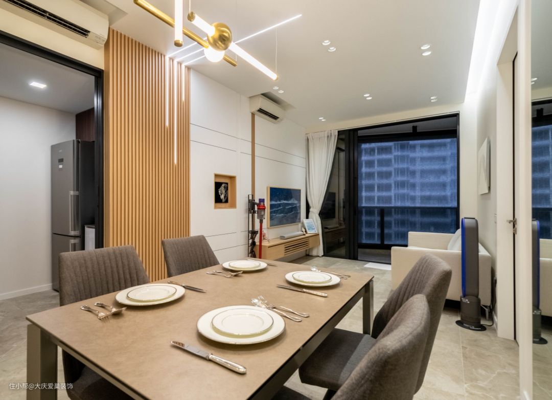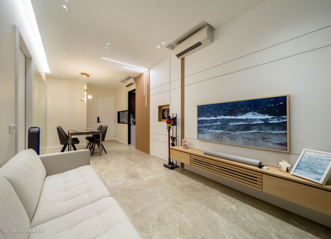 餐客厅是原始的一体式设计,在基础装修上,多采用白色的复合墙板和米色的乳胶漆打造奶油氛围感,通常这种装修我们会配合上浅色的原木地板,但是这套我们应业主要求,采用了浅棕色的地砖了,后期更加便于打理和维护。平板吊顶加上无主灯的设计让整体高级感更强