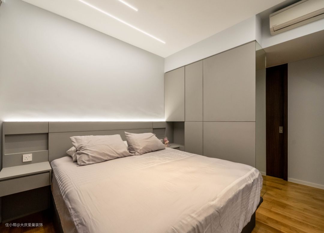 卧室采用米色加浅灰色的配饰选择,床头用定制护墙板的形式代替床靠,显得更加大气。