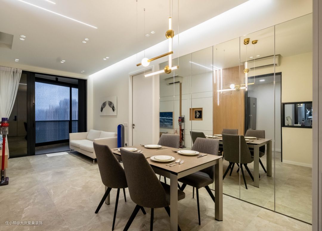 餐厅这里我们在一遍墙面采用镜面装饰以增加视觉延伸感。餐桌椅选用这种卡其色调的颜色,跟整屋的色调搭配相得益彰。