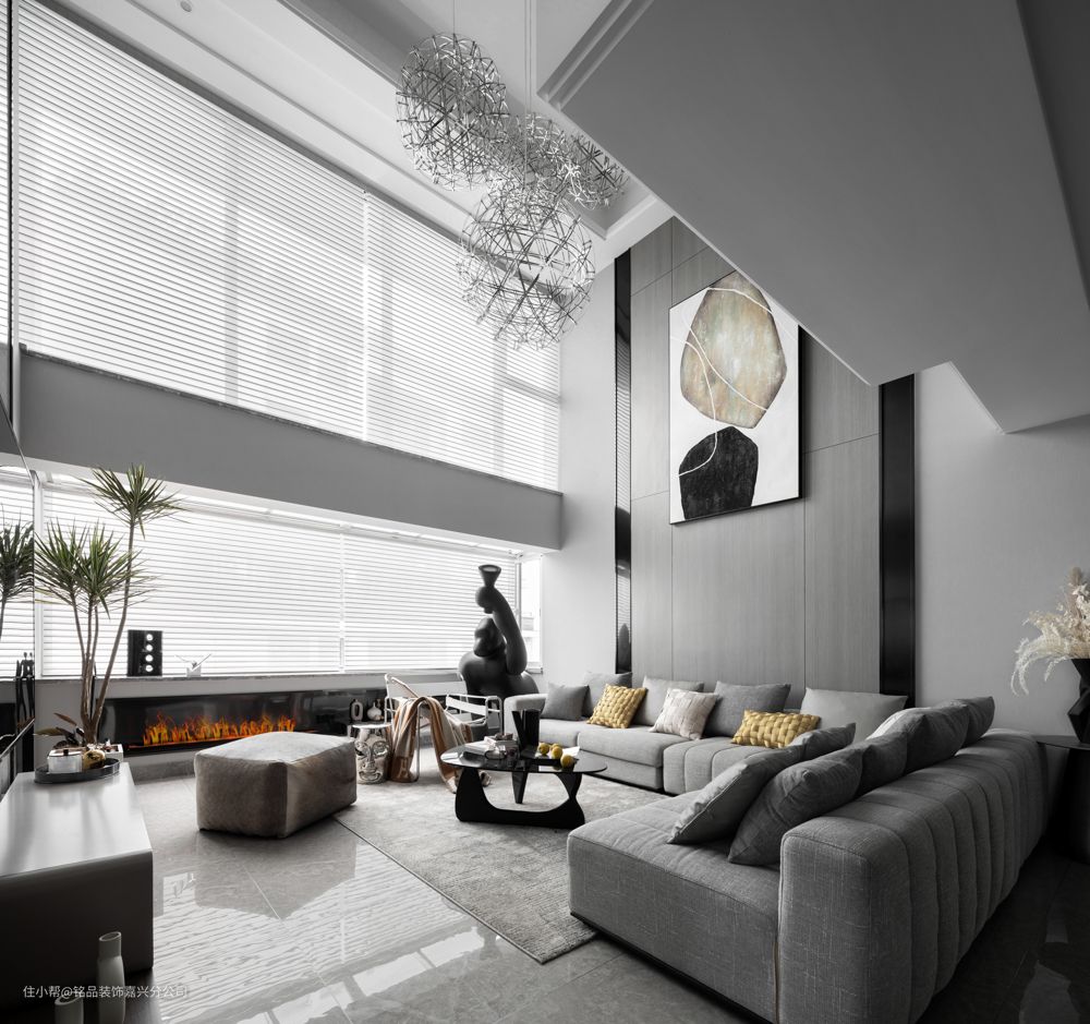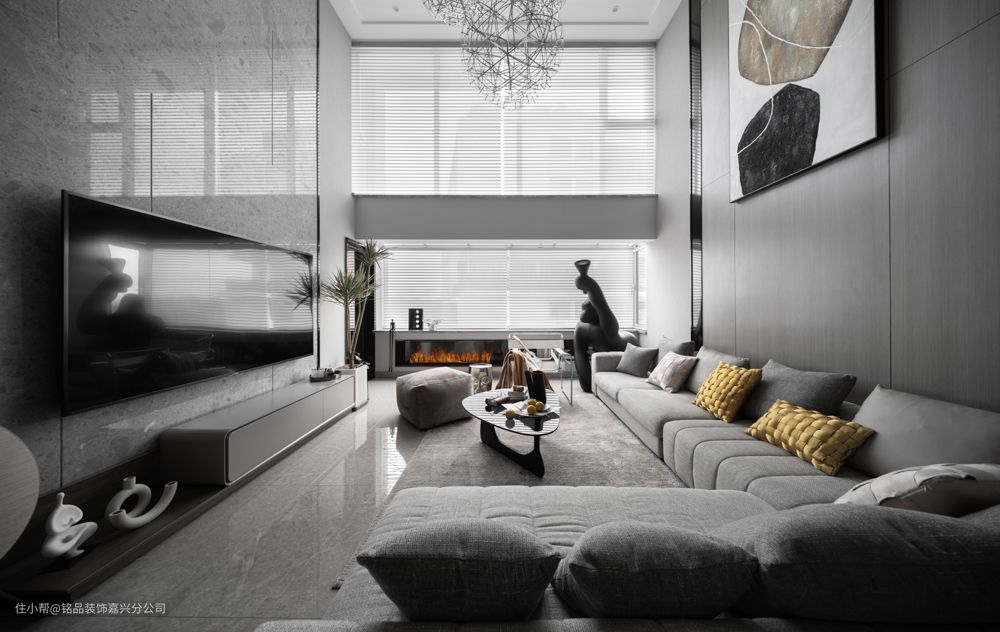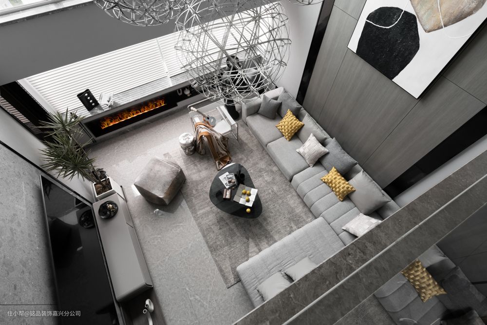 浅灰色布艺沙发,朴素而不失雅致,白色单人椅,设计造型感十足,再搭上一幅大尺寸的几何装饰画,整个客厅显露出不张扬的高级感。从二楼俯视,客厅格局规整而方正,极简化的设计搭配绿植与姜黄抱枕,色彩上的互补、撞色赋予空间更多的活力,加之燃烧的壁炉,更具温馨感。