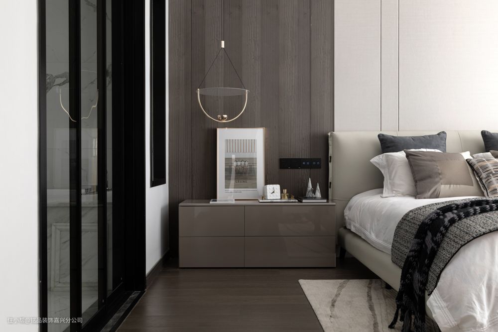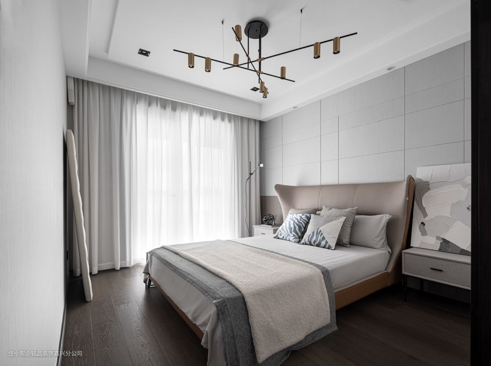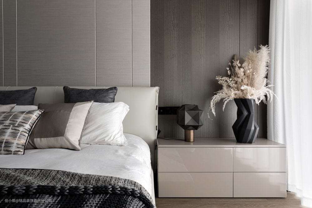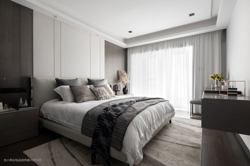 主卧的设计依旧以黑白灰为主体,搭配颇具质感的地毯及床褥,令空间更具温度。