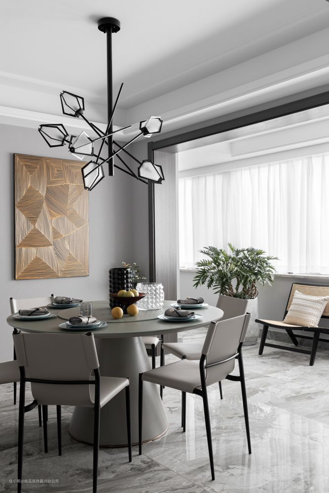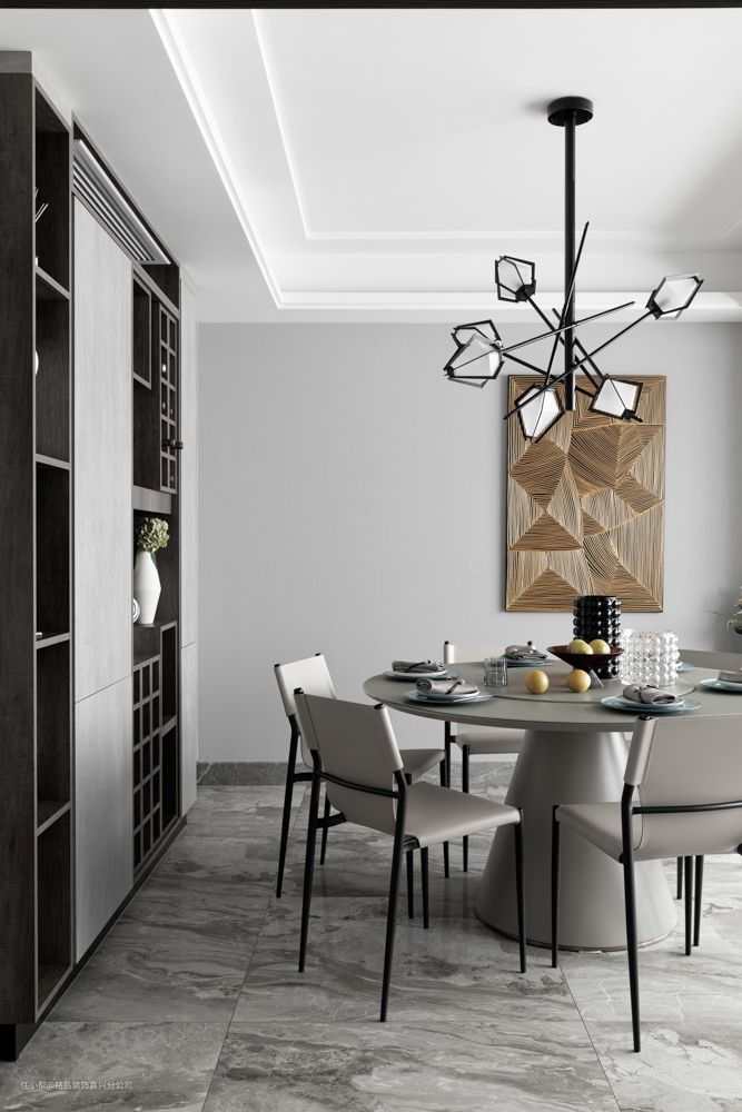 皮革餐椅、铁艺桌脚的材质呼应着餐桌与吊灯。餐厅另一侧做了展示柜,错落有致的开放格设计,时尚感十足。