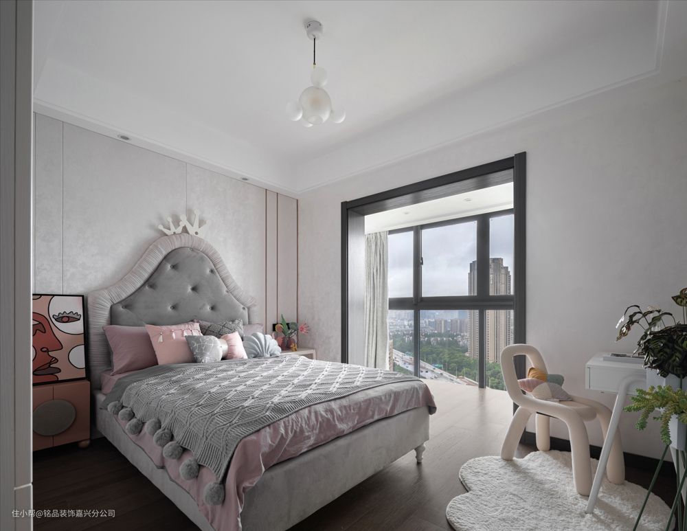 次卧的设计手法与主卧神似,但碍于空间不足,不同于主卧的无主灯设计,次卧采用明度更高的现代艺术吊灯进行照明、点缀。女儿房面朝江畔,特意采用宽大的落地窗进行搭配,令小房间也能够拥有充足的采光。