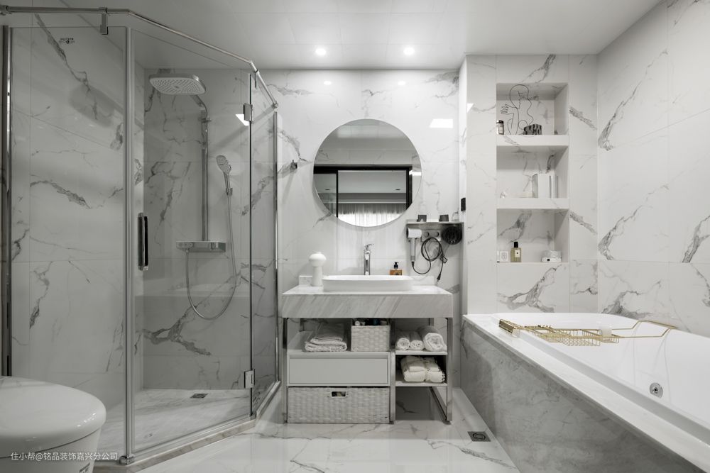 卫生间墙面、地面通铺鱼肚白仿大理石砖,雅白的空间显得非常透亮。浴缸侧墙上的壁龛随手可及,可以用来放置日常洗护的物品。