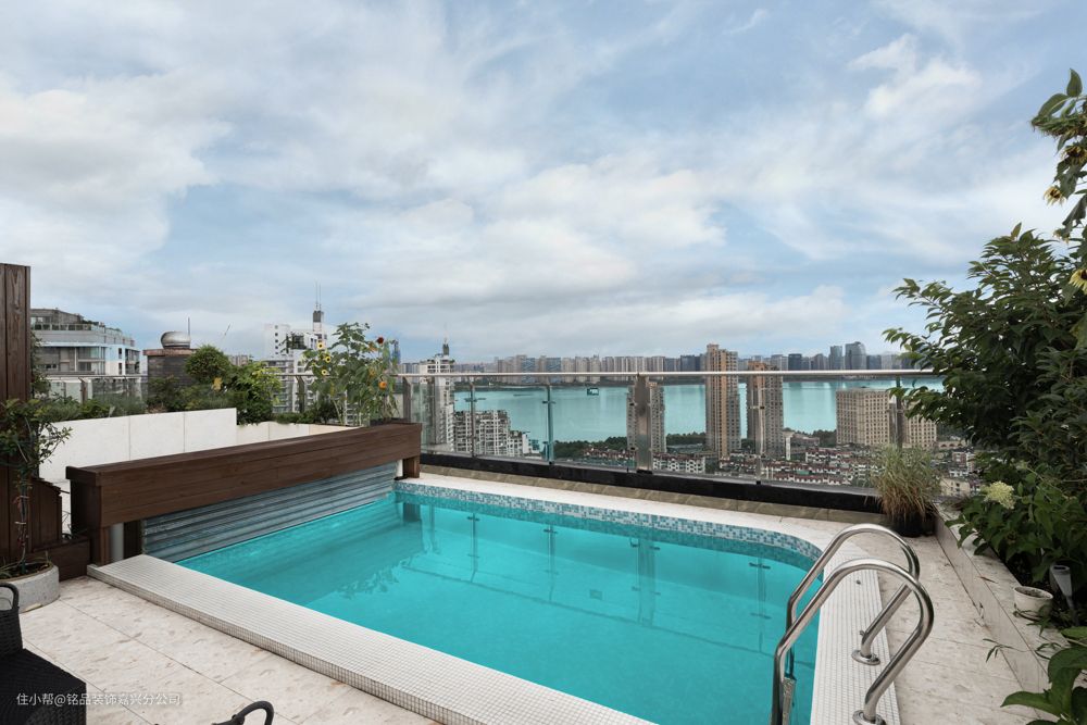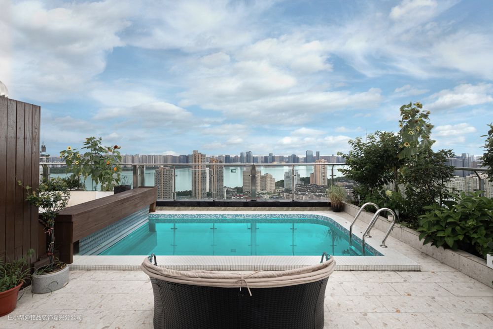 站在屋顶,钱塘江的美景一揽无余,泳池上设计了可活动盖板,冬天盖板,可以在这里享受美好的阳光,新鲜的空气。