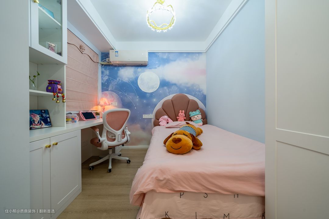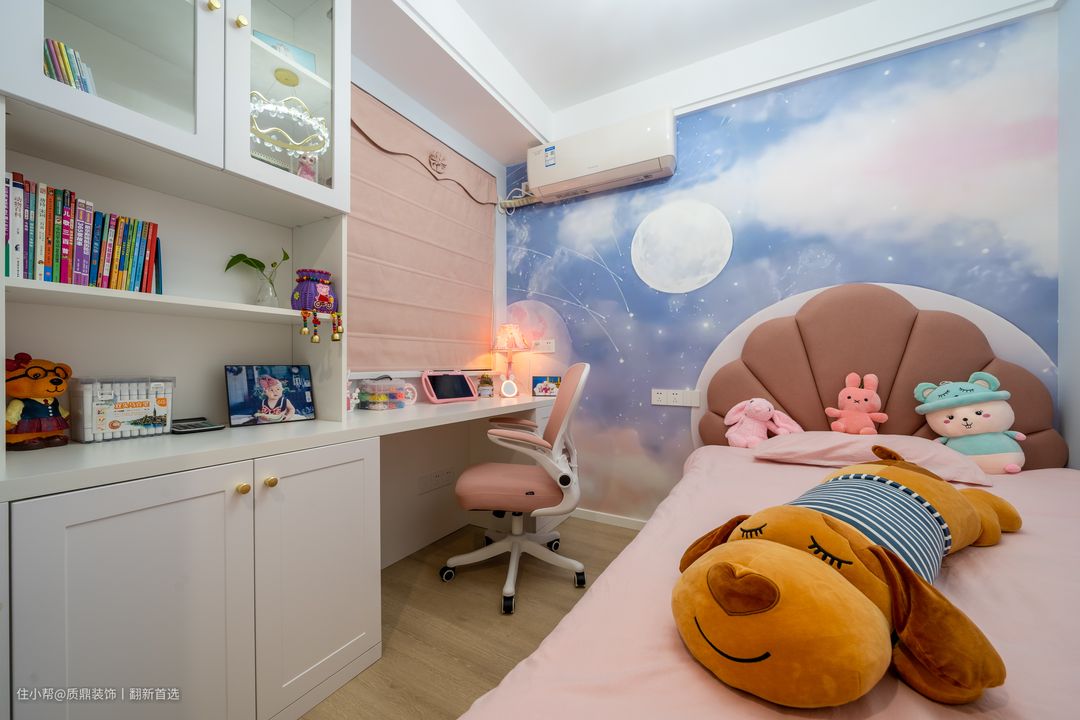 女孩的房间设计以粉色为主,背景墙用蓝色天空装饰,拥有公主梦的同时点燃内心对自由的憧憬和渴望~