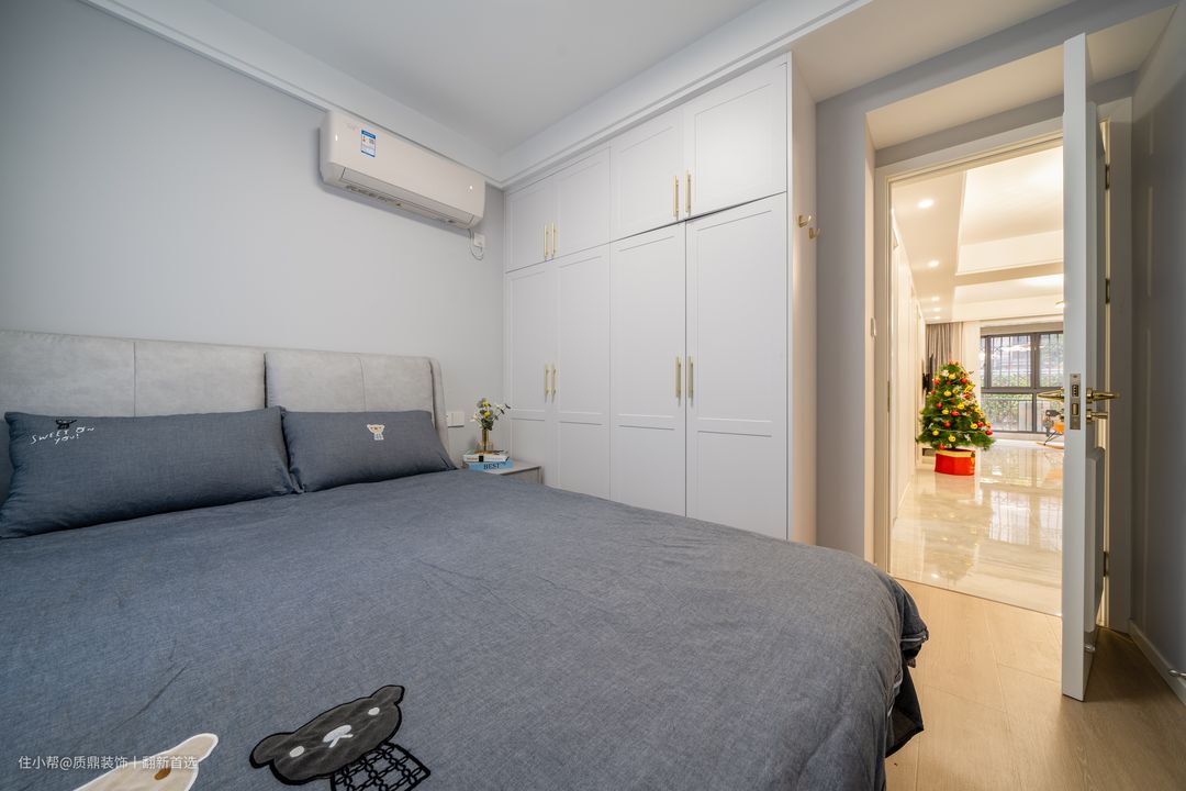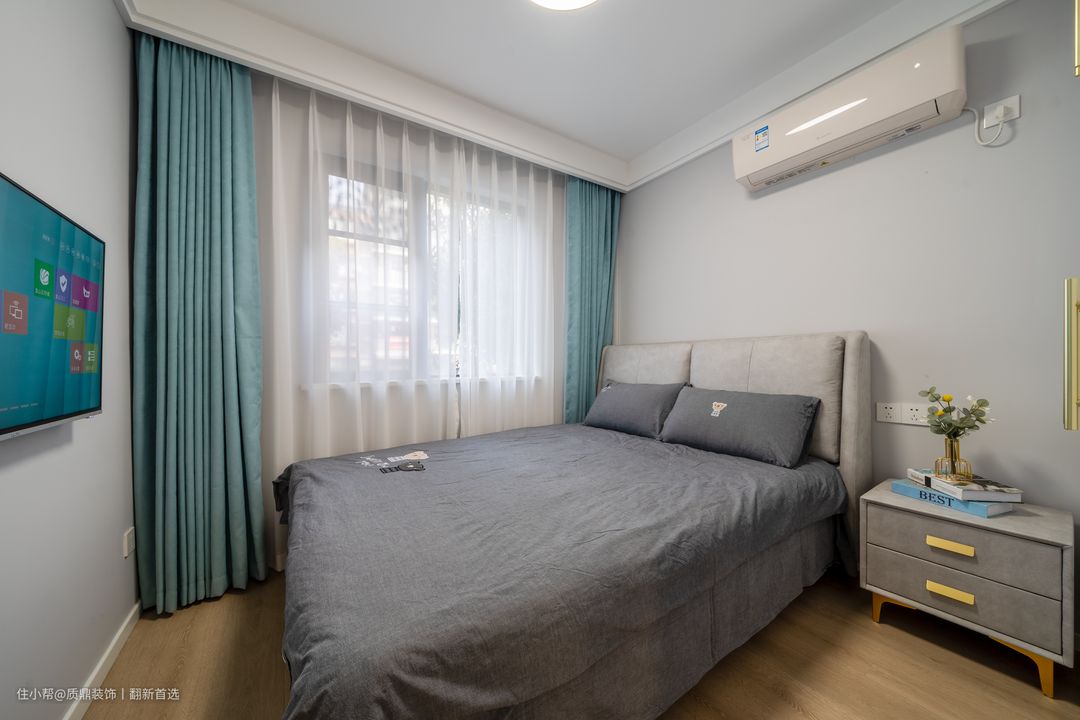 次卧是长辈房,延续轻硬装,软装搭配灰色的床品及蓝色窗帘,没有多余的装饰,简洁且实用~