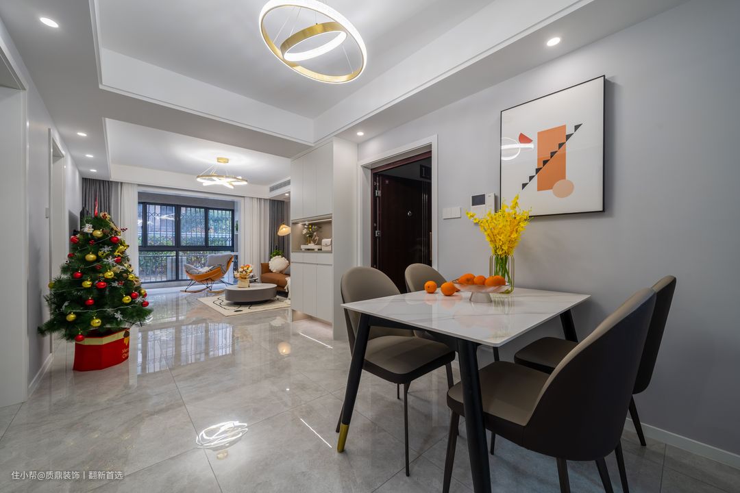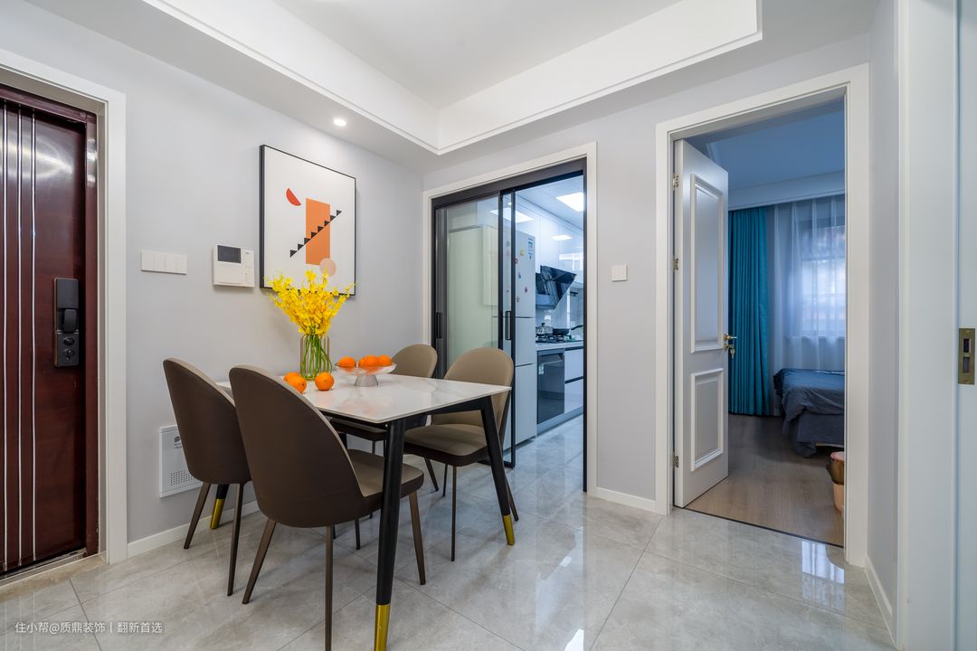 餐厅位于厨房门口,动线设计较为合理; 墙上挂一幅装饰画点缀,让用餐空间不再单调,更显情调!