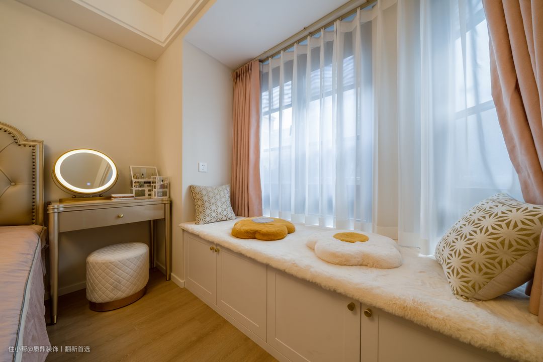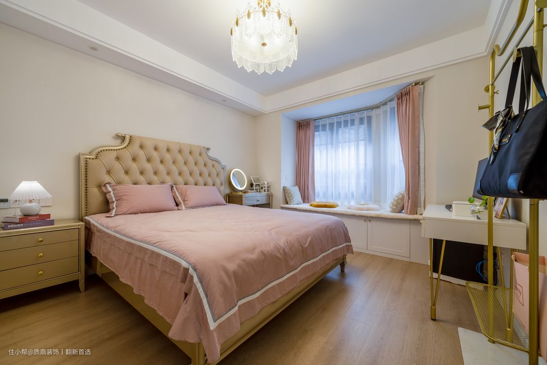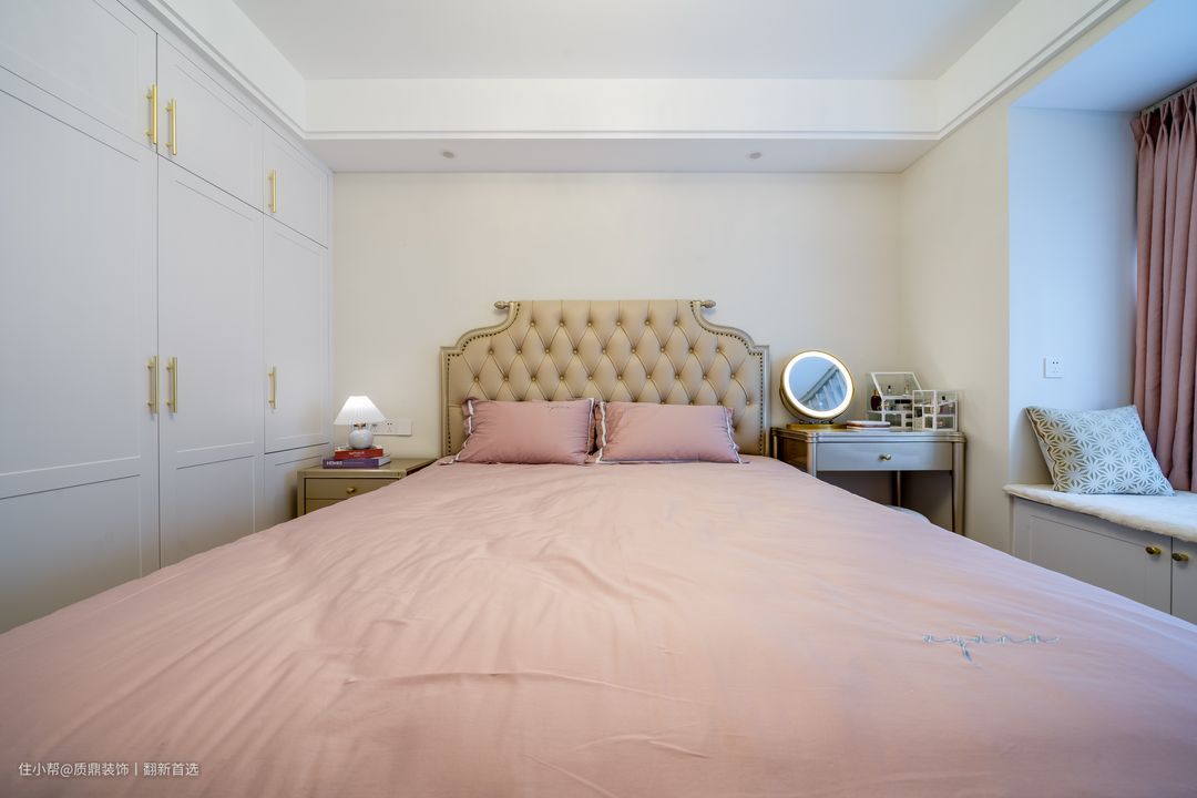 主卧硬装仍然是简洁为主,柔软的大床使人感觉非常温馨,带给屋主舒适的睡眠质量~ 飘窗的设计增加了收纳功能,上面铺设软垫,休闲温暖的感觉~
