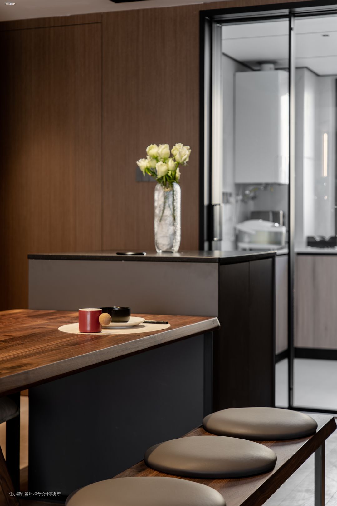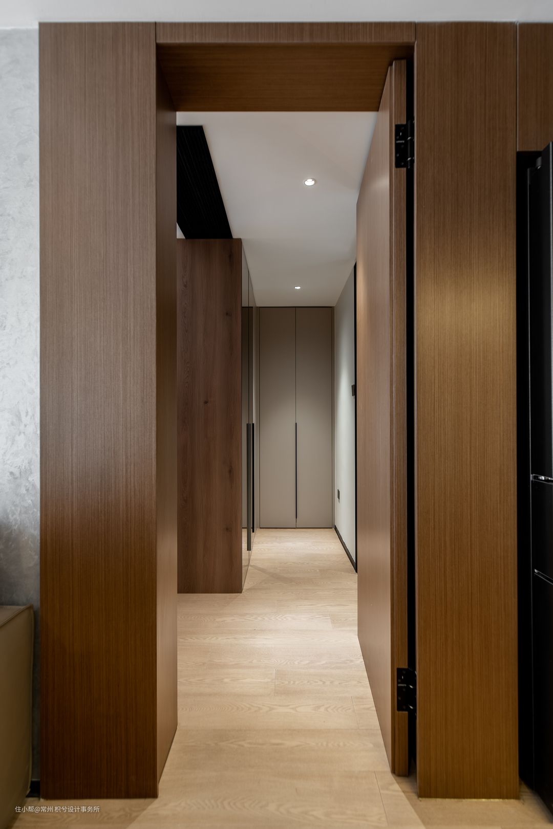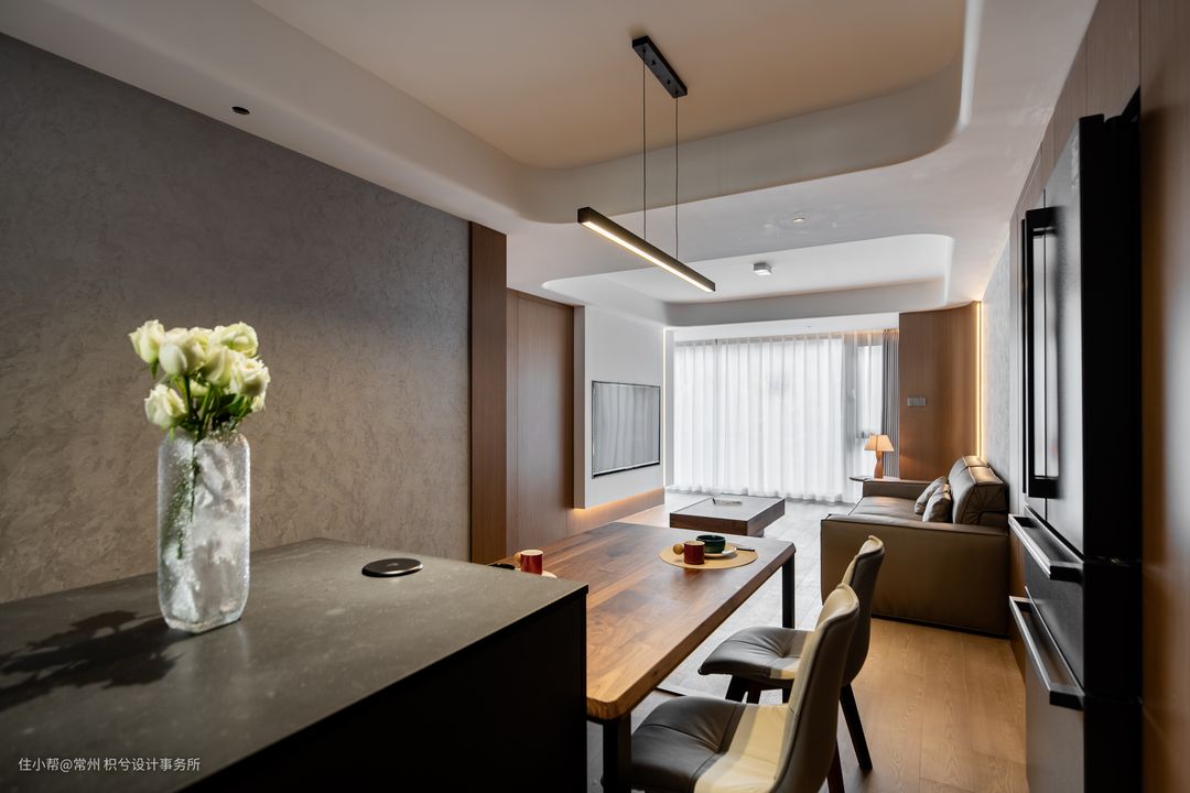 餐厅是做了高低倒台错落形式,因为空间受限又不影响正常行动空间,餐桌一侧没有使用常规餐椅。 从客厅的沙发背景墙到餐厅的餐边柜,是做了整体的木饰面设计,暗门是通往主卧的空间。 隐形门旁是承重柱,保证美观也用木饰面把它给包裹起来。墙体改造设计,做了内嵌的冰箱,如果配设零嵌的冰箱跟柜子做齐平,会更加的完美。餐边柜集收纳与电器使用功能,内嵌的直饮机,银色的金属的质感颜值UP!