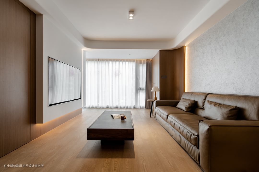 悬浮电视背景墙简约处理,电视机内嵌,提升整体颜值,配合灯带营造氛围,右面圆弧储物处理,使空间更加柔和。