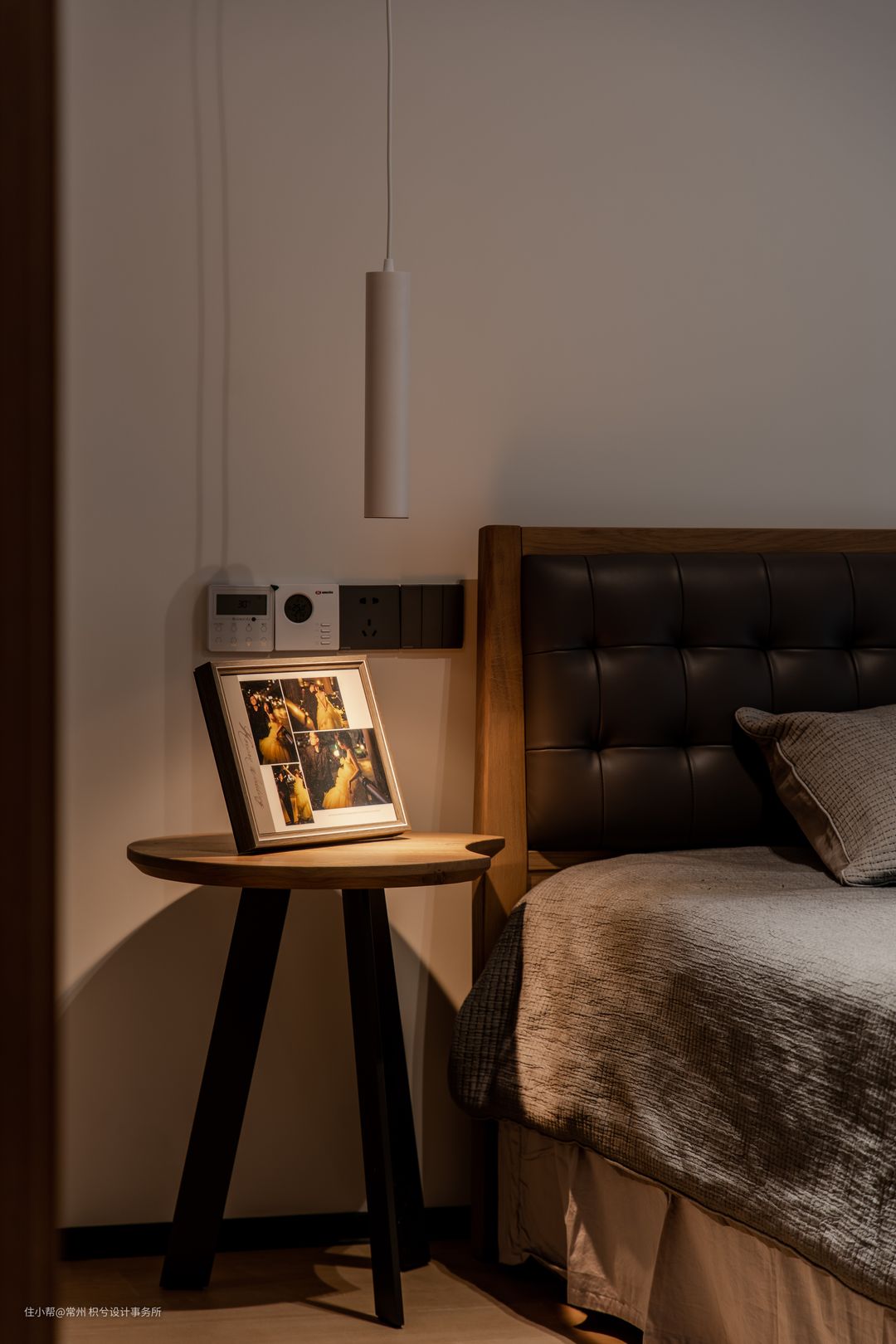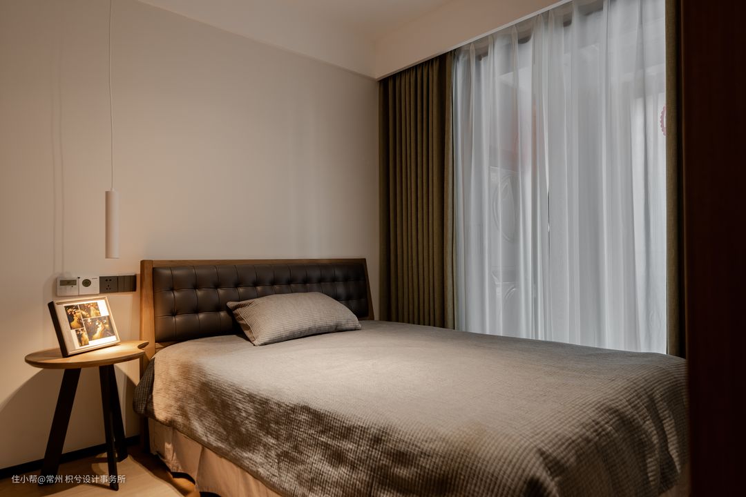整个空间是比较简洁的,灯光只做了一个明装的一个射灯,配合着床头的一个吊灯,满足光照同时,增加整体氛围,吊灯的色温是3500k,高度可上下调节,这个灯光的高度一般是建议在插座上面的15到20公分。