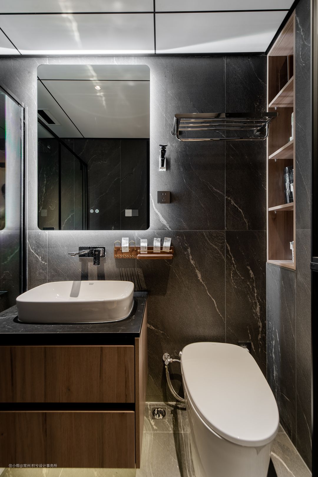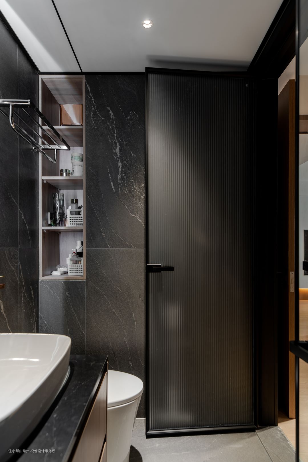 整体暗黑的色调,墙面是哑光深灰色的瓷砖,搭配黑色的岩板,体现质感。整体卫浴都是墙排内嵌的形式。壁龛增加储物收纳。