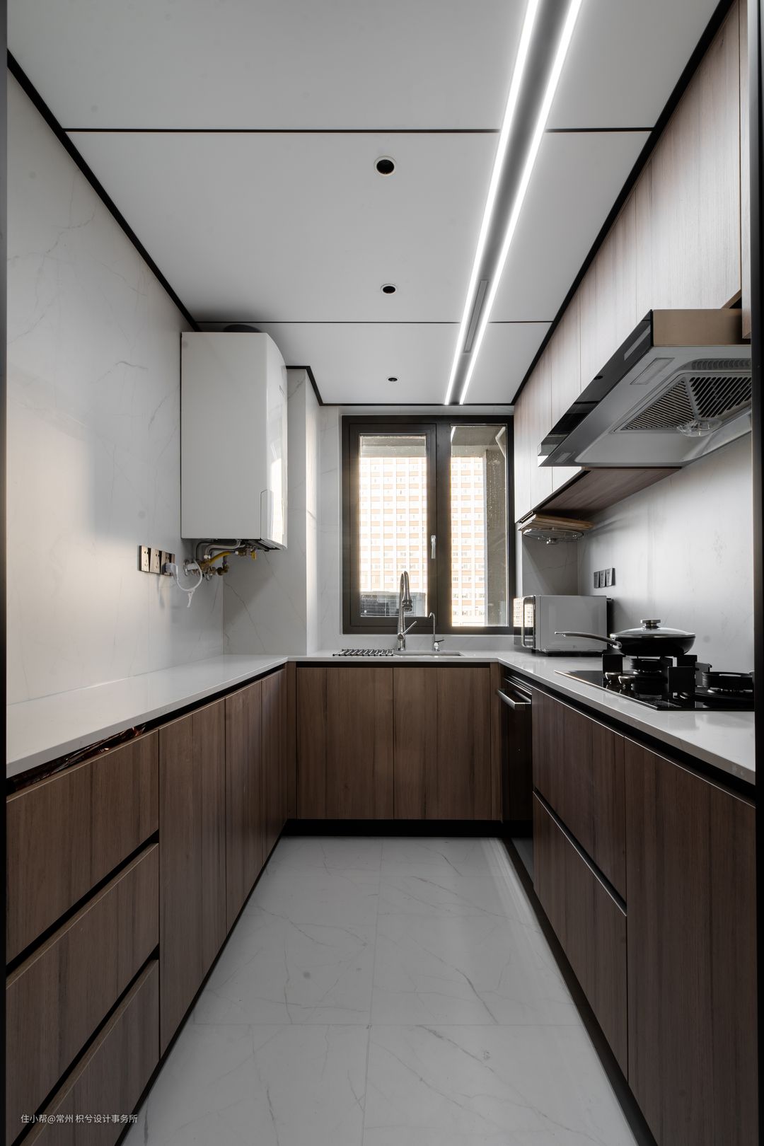 厨房的移门是内推式隐藏的,可以做到半开放式,使空间更宽敞,整体U型的操作台面,因为空间较小,为过道保留一米左右空间,侧面的操作台在40公分左右,增加它的收纳和台面的使用。