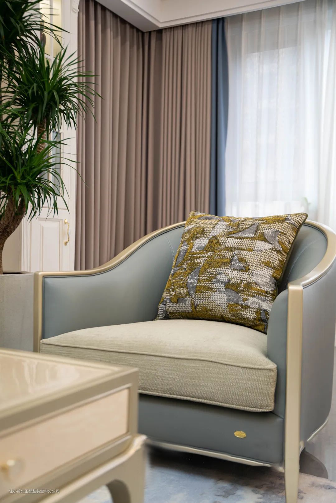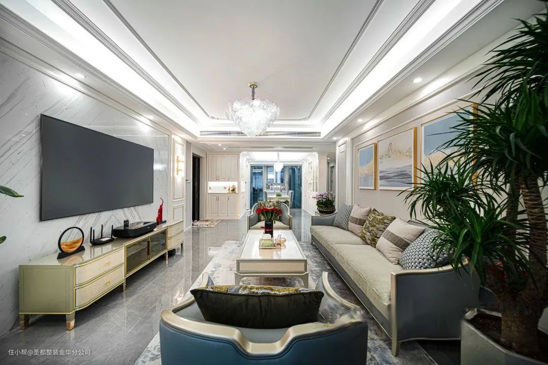 进门首先引入眼帘的是充满自然风情的热带雨林背景墙画,以大自然作为创意灵感,将一方雨林织于家居之中,打造东南亚风情“乌托邦”。让家居回归自然,幻发勃勃生机,收获深沉而又平静的力量。客厅沙发区,温润的美式家具配上美式简约线条护墙板,真的是非常耐看。舒适的蓝色沙发搭配浅色的大理石茶几,温润又雅致。在水晶灯和绿植的点缀下,整个空间温暖又醇厚。 电视背景墙设计的比较简单,就是简单的大理石墙面,左右两边用精致的美式护墙板对称装饰,整个空间简洁又时尚。 在单人沙发里,享受片刻的安静和舒适,喝喝茶、看看书、玩玩手机,或者简单地发个呆,都是最好的充电方式。