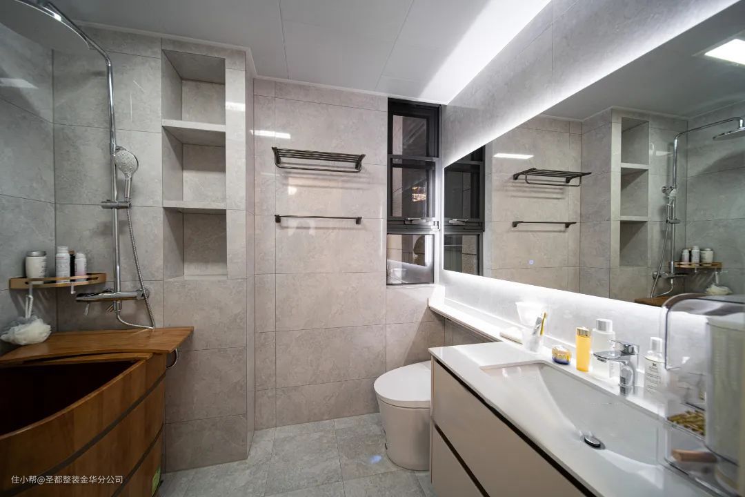 本案房子的风格布局是女主人喜欢的美式,整体温馨舒适、优雅大方。在各种材质的交错变化中,带出了层次的丰富感,整体环境的氛围加上巧妙的收纳设计让居住空间的机能与美感都兼具了。 1.打破原有阳台格局,一半纳入客厅,增加客厅活动空间,一半规划为生活阳台; 2.将西北侧房间的墙体打通,作为衣帽间和书房使用,增加收纳功能; 3.随处可见的弧形线条柔和优美,减少空间锐度,舒展出丝滑柔顺的家居图景。