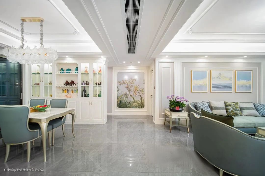 浅色系的餐厅色调给人轻松的感觉,在水晶吊灯柔和的灯光下,显得格外温馨和谐。两侧的收纳柜实用性十足,日常的藏酒、水具摆放其中,一同营造雅致惬意的生活氛围。