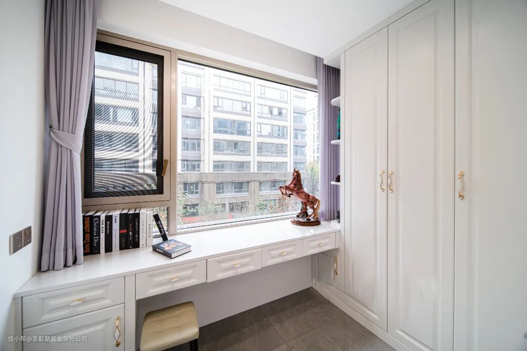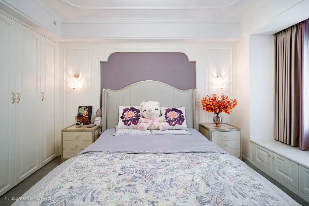 主卧以温柔的紫色为主色调,营造柔和宁静的睡眠空间。淡雅的色调更有助于释放压力,暖白的柜体,打造出了恰到好处的质感。