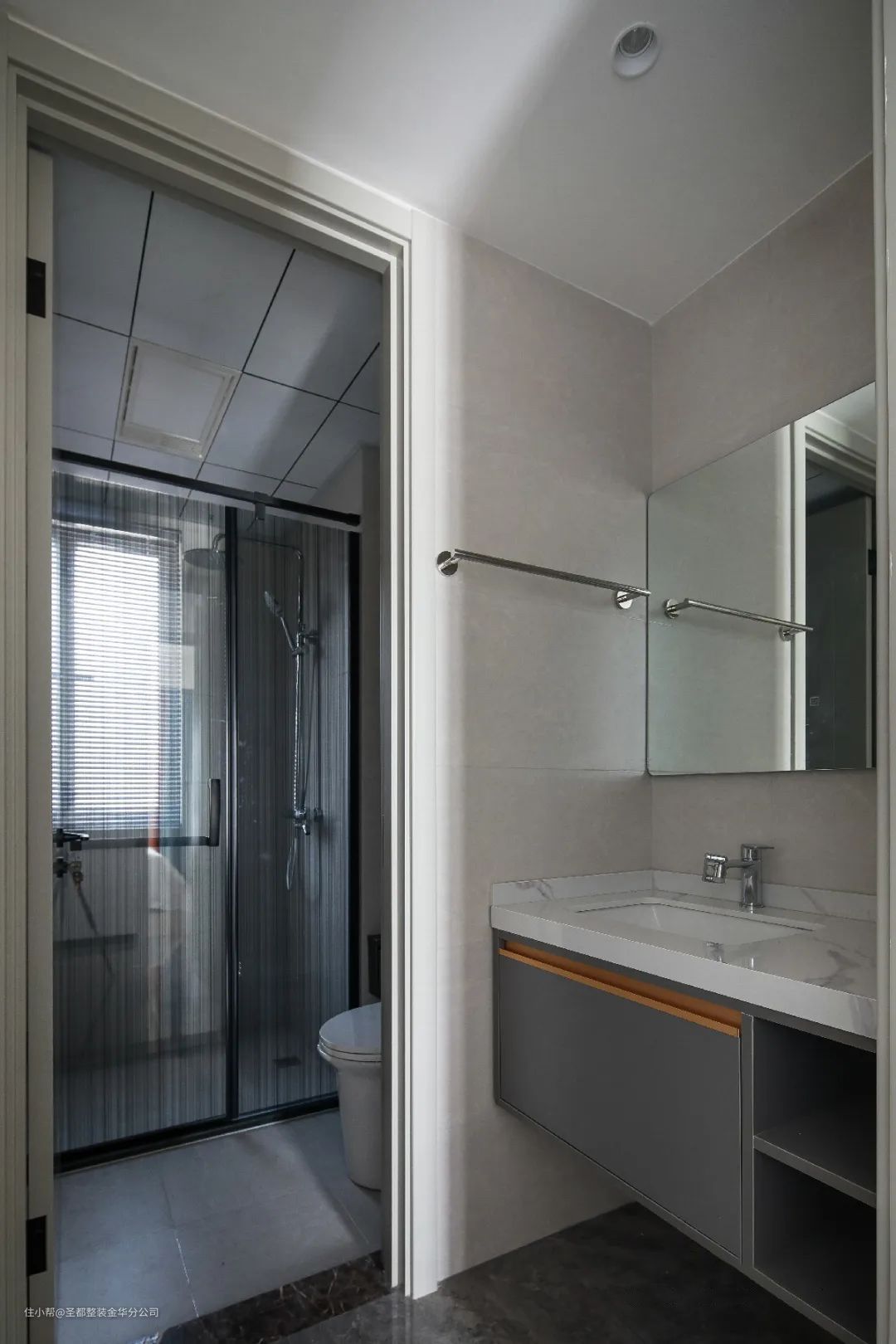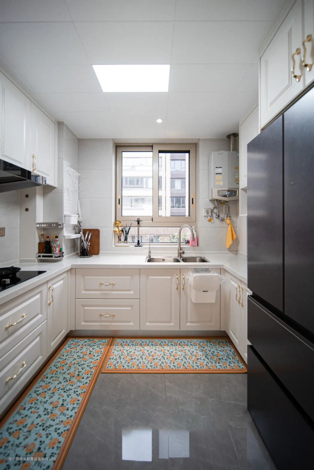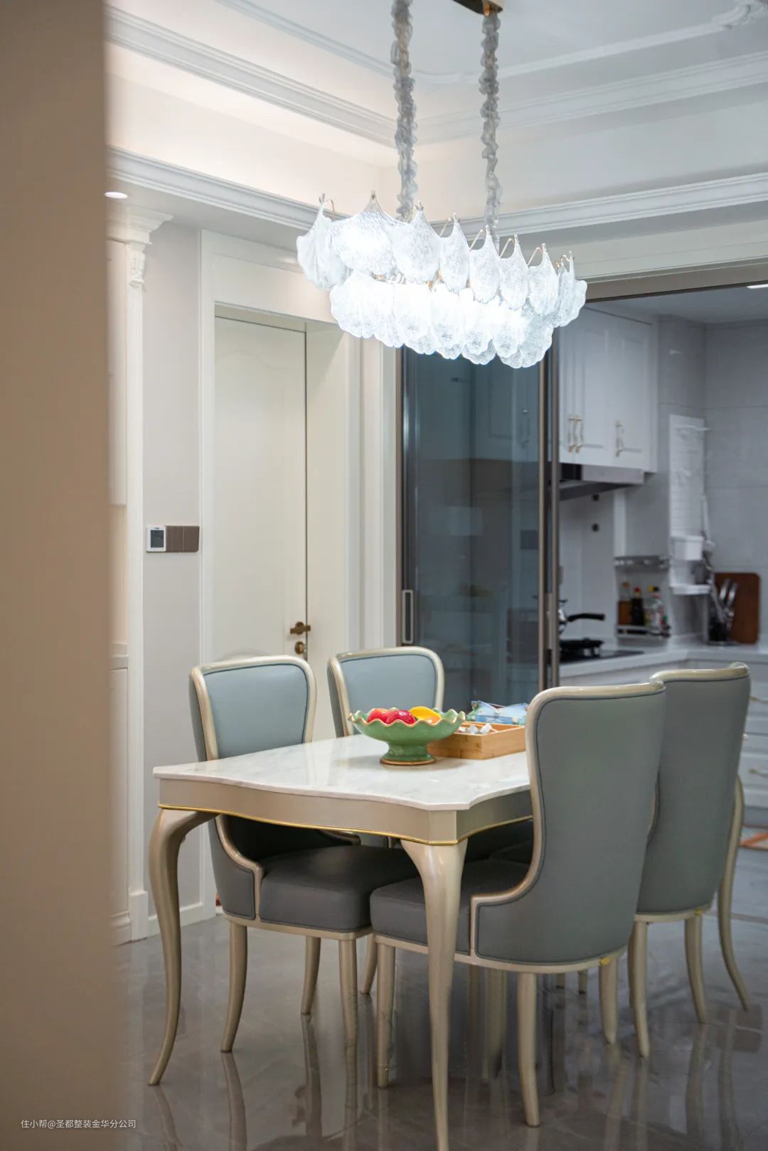 餐厅设计与客厅是相通的,中间以玄关厅作为隔断,三者合而为一,让家居空间得到最合理的利用,显得既宽敞又舒适。厨房空间白色柜体与灰色地砖搭配,既明亮又有整洁感。这里是体现家温度的空间,所谓人间烟火,至味清欢。