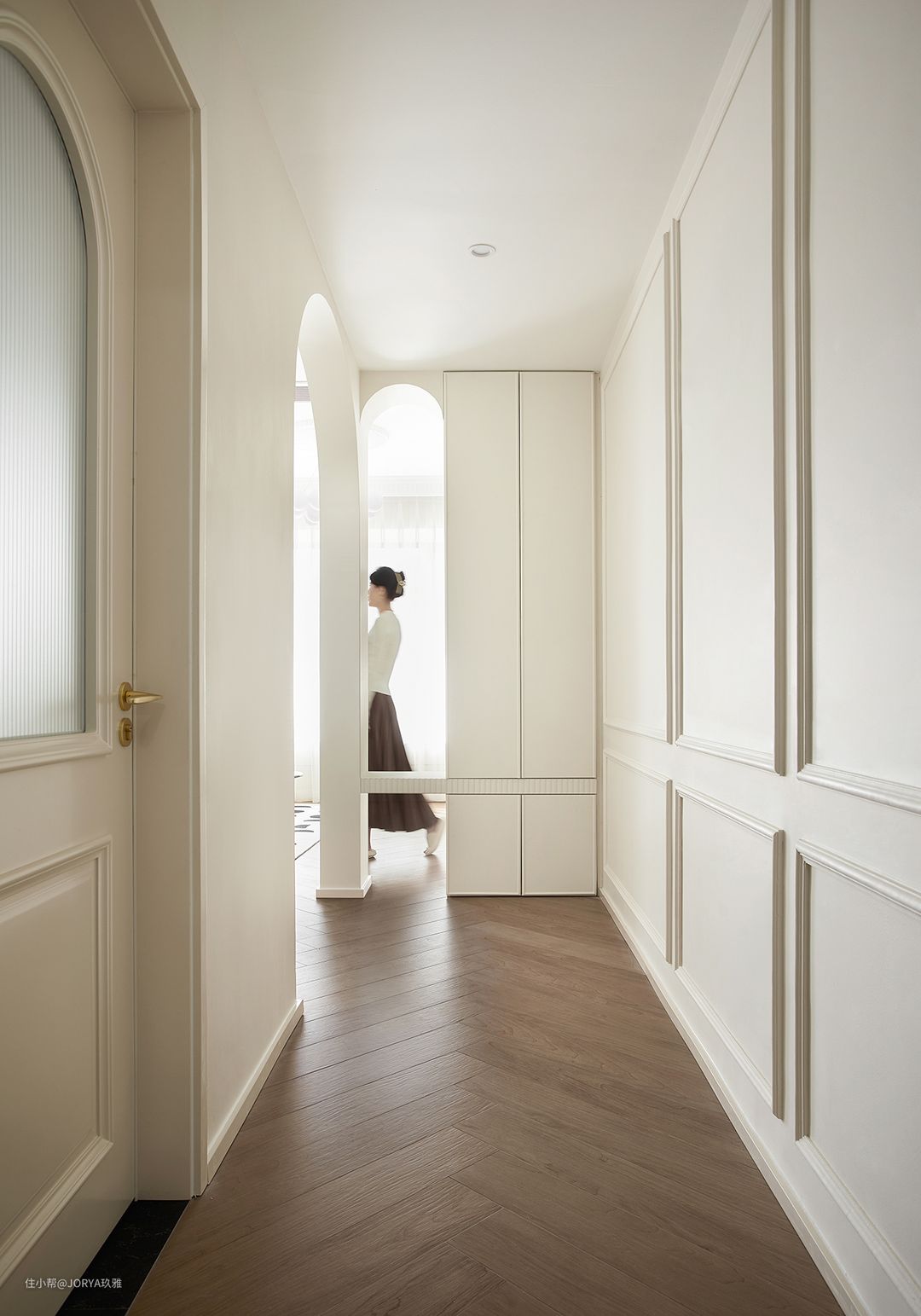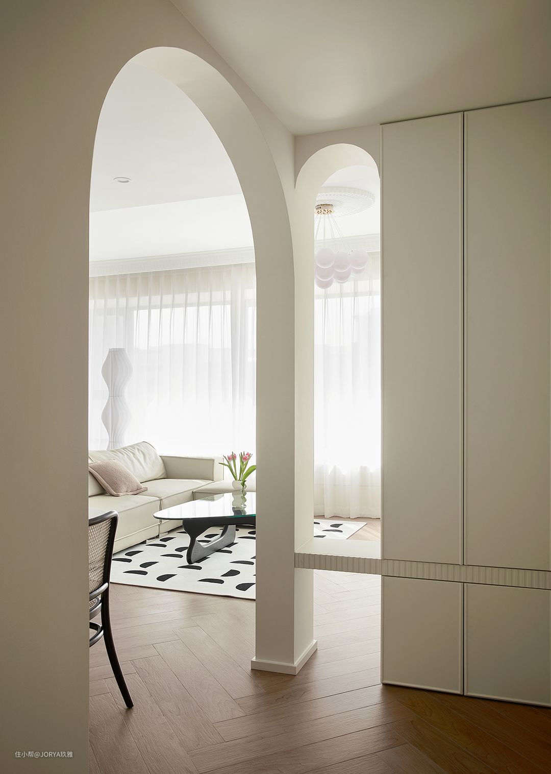 进门过道宽度只有1.1米,只能放一个小小的鞋柜,显然满足不了储物需求。需要一组像样的玄关柜。 用轻钢龙骨新建的两个拱形门洞,小拱形衔接门厅柜,大拱形衔接餐厅。 设计师将这组玄关柜放到了餐厅侧面,面对入户门摆放。一边当作玄关墙遮挡进门视线,一边也能衔接电视柜,当作电视柜的收口。当然孤立的一个柜子肯定不美了,设计师新做了两个拱形门洞,用来连接这个玄关柜。 小门洞,下面设置有隔板,可以当作换鞋凳,也可以摆放饰品,当然最主要的还是让视线不会全部被遮挡,若有若无,增加趣味。另一个大门洞变成通道,邻着餐厅,通往起居室。