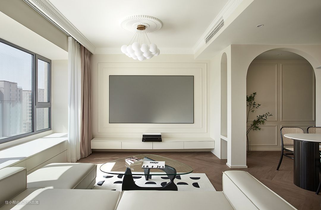 客厅区域一分为二,一半是起居室,一半是儿童玩耍区。沙发居中摆放。 业主喜欢盲盒手办、也喜欢收藏、设计师利用公区的过道布置了一面泡泡玛特墙。玩偶上墙也为奶油的客厅增加了一处色彩。 巨大的飘窗地台也进行了充分利用,上面做了抽屉柜,增加储物。坐在上面晒太阳欣赏美景,惬意。 玄关柜作为了电视柜的收口,并且颜色进行了统一。电视墙用双层石膏线进行了勾勒,这么看起来投影幕显得更大。 球形的客厅吊灯搭配古典造型的石膏灯盘,有一种现代与复古的冲撞感,得益于都是浅色,并不突兀。