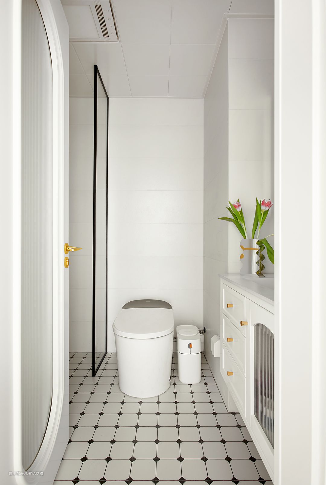 两个卫生间的都通过黑色点状的地面图案来统一风格。