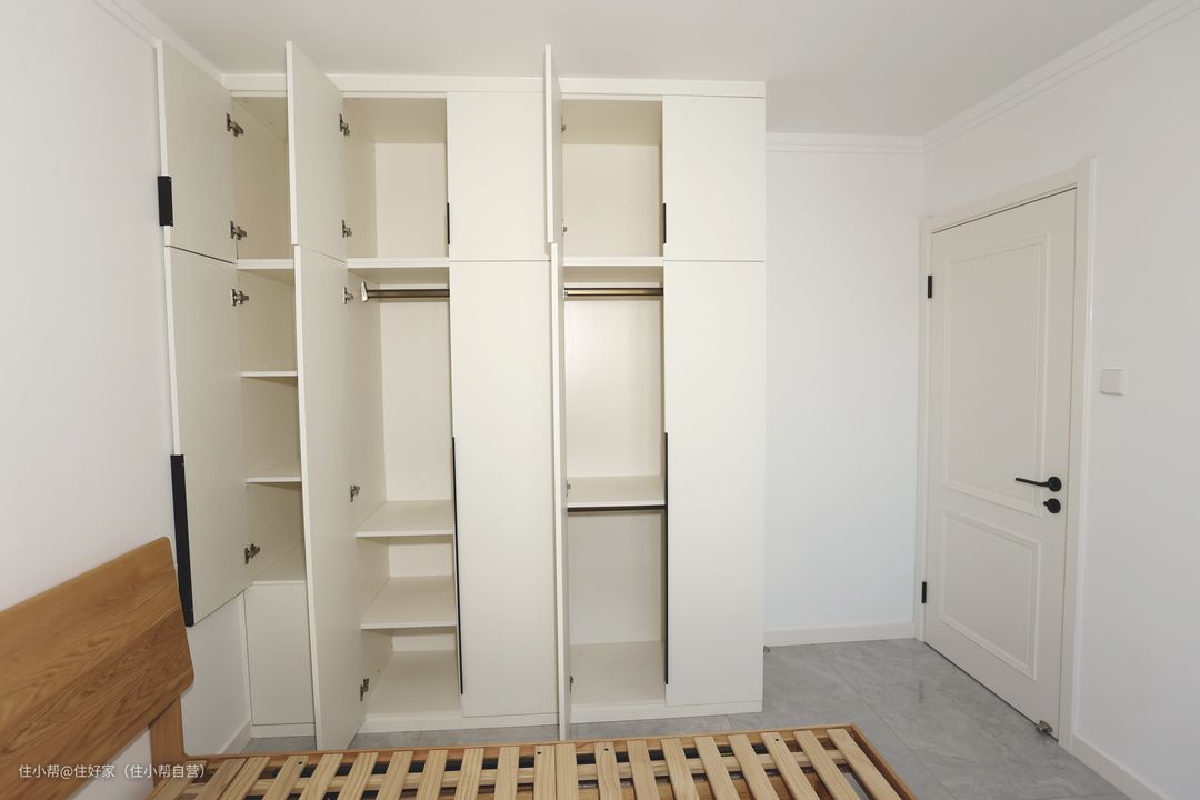 后期会在床尾放置一张斗柜,可以分类收纳袜子、内衣等衣物,扩充储物能力。