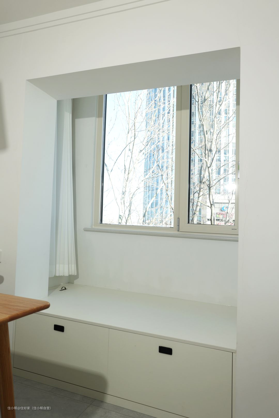 业主希望家里多一点储物空间,又不知道该如何利用阳台,所以设计师在两个阳台处增加了储物功能。 大阳台长3.1m,宽1.6m,沿着两根梁柱的空隙定制了满墙通顶柜,内部空间比较大,可以分类收纳零散的工具。靠窗的空隙也增加了一个矮柜,上方留空可以当置物台,也方便日常打理窗户; 顶部安装了自动升降晾衣杆,建议提前跟设计师和工长沟通,吊顶时预留位置做成内嵌式,不用时收起来,视觉上有隐形效果; 后期可以在阳台中间摆几张轻量藤椅+极简圆桌,装上梦幻帘,就是一个高颜值的休闲区了! 小阳台面积只有1.15㎡,比较窄,更像飘窗,属实比较鸡肋。设计师索性为小阳台定制了一组抽拉式的储物柜,上方也可以整个拉起来,还可以置物,同时兼顾了餐边柜的作用。