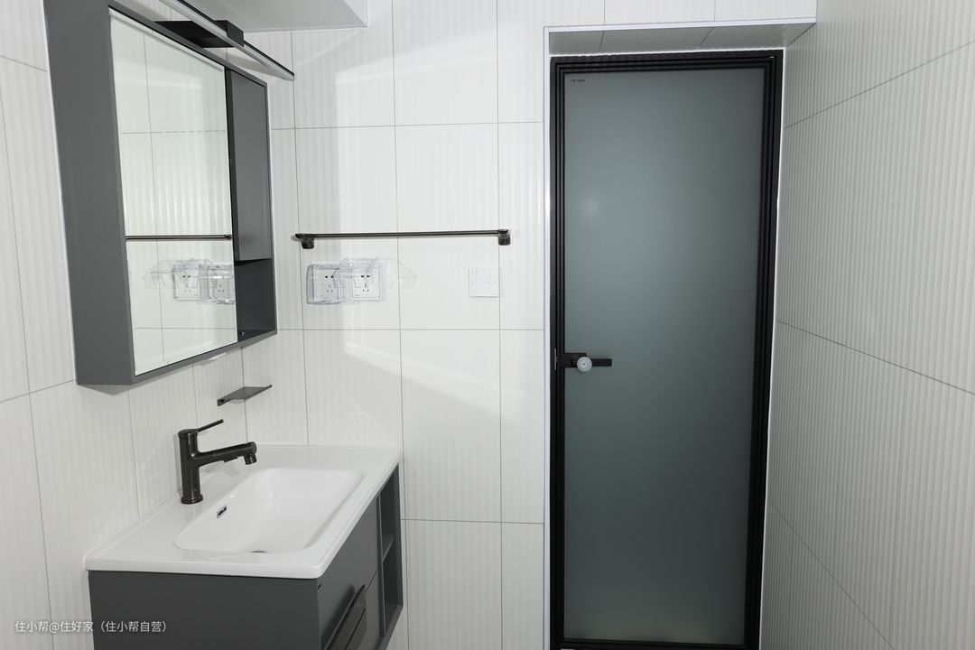 卫生间是明卫,5.4㎡,干湿区都刷了两遍1.8m的防水,整体安全性和防水性较高; 墙面是定制的300*600mm白色竖纹砖,颇有层次感,可以让空间更加活泼,防滑性能也不错; 业主选择了黑色恒温花洒,典雅有质感,很上档次,但缺点是不太耐脏。水温不会骤冷骤热,舒适性更高; 智能马桶旁边预留了插座,带防水盖,不用担心受潮问题,保障了安全性; 洗漱池一定要装陶瓷一体盆,清洗无死角,也不用担心掉盆问题。