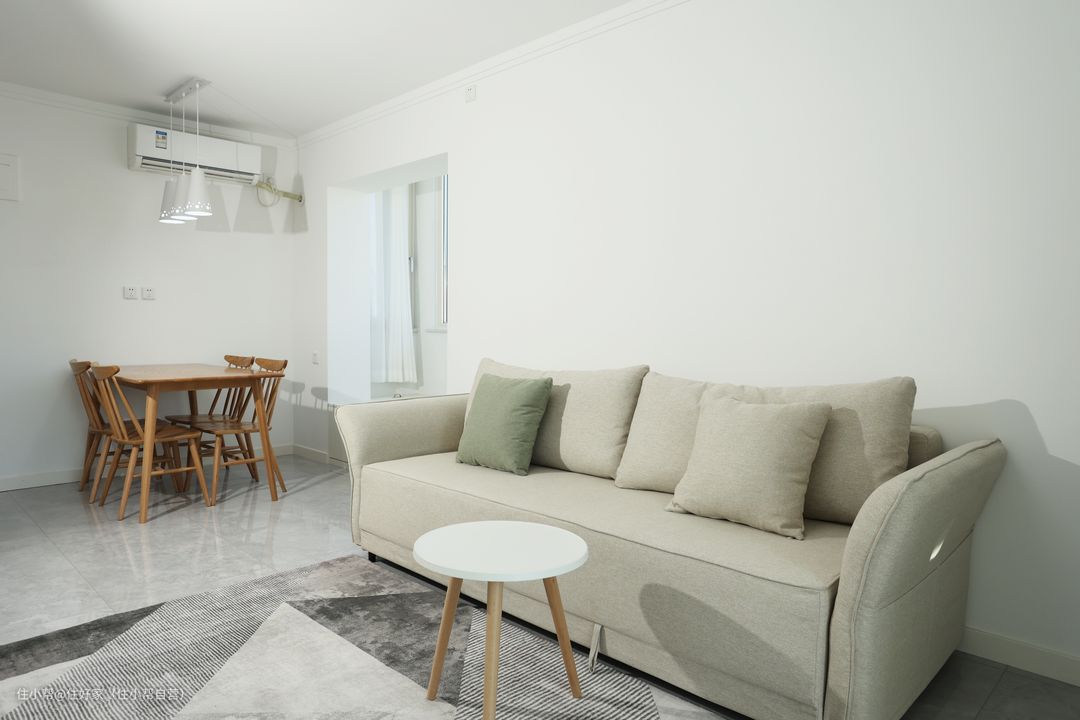 欧普三头白色繁星led餐顶灯(约300元),长0.6m,高1.2m,亚白铁艺灯罩上的镂空图案,美中带着点轻奢风; 源氏木语直排布艺沙发床(约3200元),下方有双层储物空间,拉开后内径130*200cm,可当作简易的双人床,来客人也不用担心没地方住,极大地提高了空间利用率。