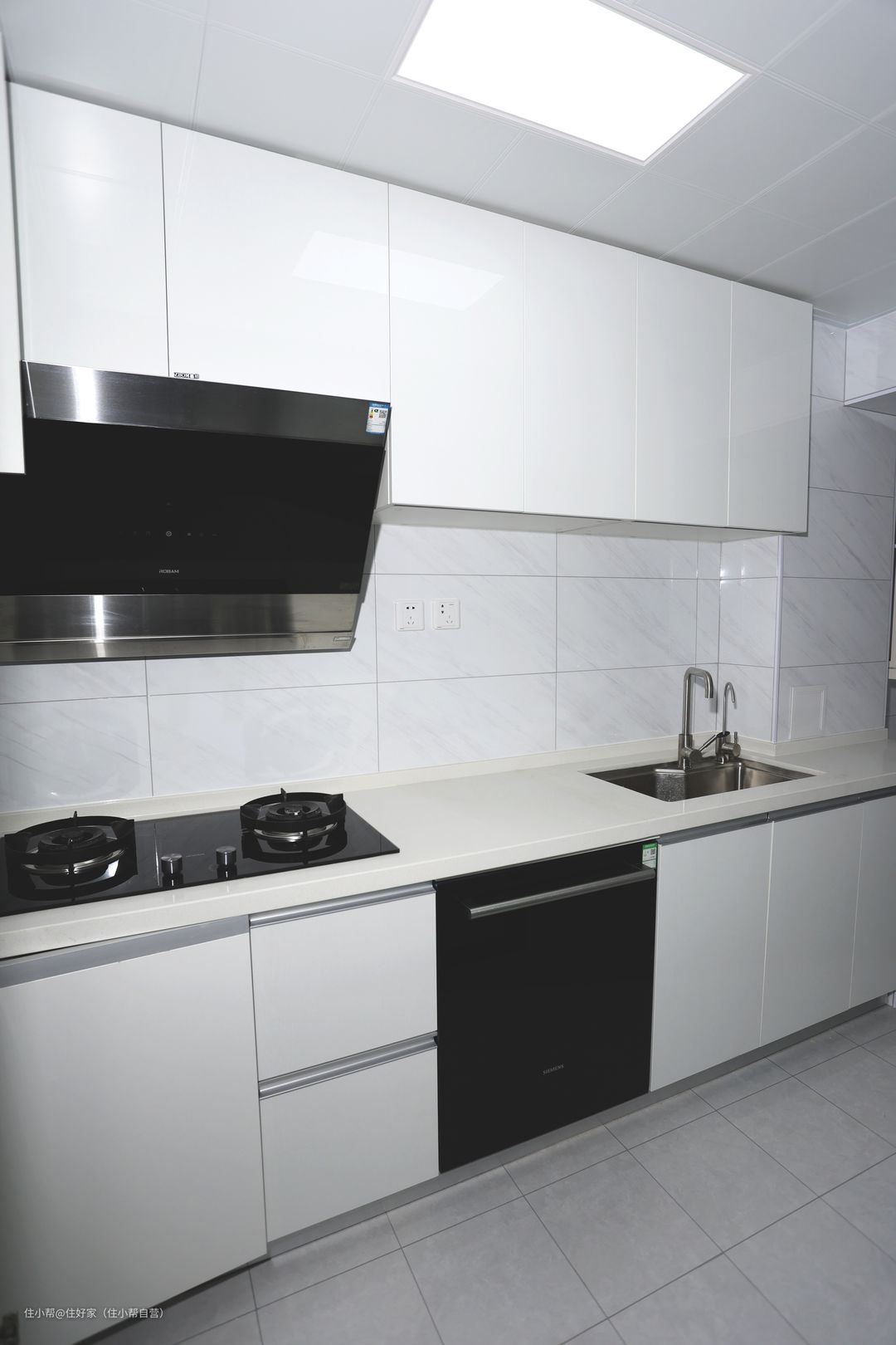 厨房面积5.9㎡,L型布局,按照洗菜—备菜—烹饪—出菜的动线设计,预留了95cm宽的过道,两个人操作也不显拥挤; 墙面是300*600mm的马可波罗93508瓷砖,留缝2mm,搭配白色柜体和台面,明亮干净,做饭的心情都会跟着变好~ 法狮龙铝扣板吊顶(KY501-1T),有良好的防潮防油污性能,而且美观大方; 大单槽的台下盆非常实用,整个锅具都能摆的下,清洗时不会弄得到处都是水渍; 2个水点位,8个插座,烹饪起来会十分方便,小电器也都有地方摆放。