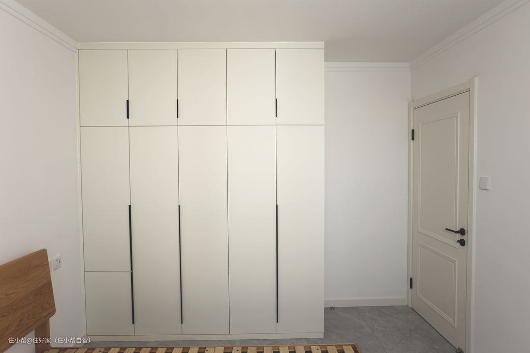 主卧11㎡,定制了分段式衣柜,留出了开门区域,白色柜体搭配黑色极简长条拉手,十分高级,衣柜内部分区是按照业主需求来设计的,挂衣区、叠放区、被褥区井井有条; 卧室门是TATA瓷白免漆门(T202),尺寸为300*900*1200mm,回字造型,线条感很强,简约耐看。踢脚线和门套颜色一致; 提前预留了窗帘盒,隐蔽美观,也不用担心顶部落灰问题,早上也不会被阳光晃醒,遮光效果很好。 床头插座预留了USB口,睡前可以直接用usb数据线对电子产品进行充电,既方便,又能节省购买插头的成本。