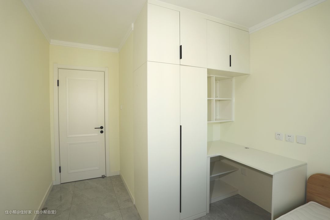 次卧是儿童房8.2㎡,墙面刷了LHR-011米黄色乳胶漆,比大白墙多了一些温馨感。 要兼顾储物+学习+休息等多种功能,因此做了转角书桌+衣柜一体化设计,上方和下方预留了三个插座,方便台灯、电脑的使用; 书桌台面下方无抽屉,孩子学习时久坐不累,腿部活动空间足够。左侧台面下方是隔板设计,可以充分利用空间,上方开放格吊柜可以摆放书籍和学习工具。衣柜收纳孩子的衣物和被褥刚刚好。