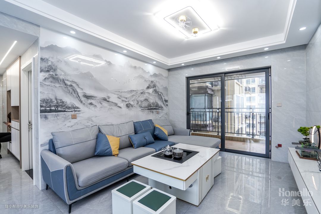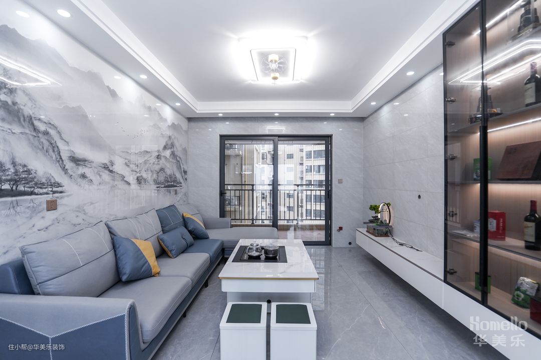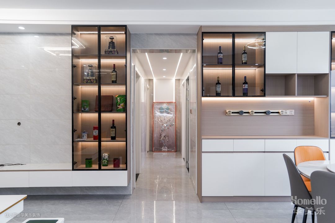 电视背景墙打造了L型的电视柜,立式玻璃柜内部有内置灯,往里放置的装饰或者酒品能有更好的呈现姿态,很好地给客厅提升颜值与档次;下方横向的柜体主要用于补充收纳能力,让一些工具或者杂物也有合理的安放位置,柜面空间则可用于放置绿植或者迎合气氛的摆件,增家客厅的生机。