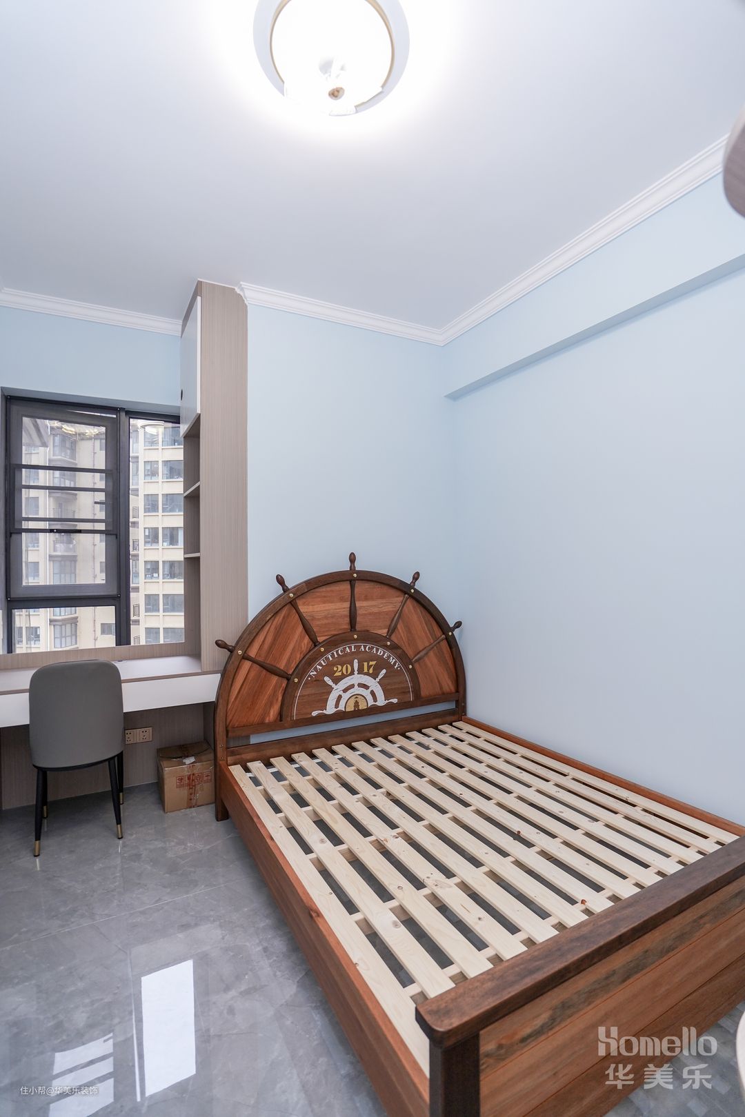 海主题的原木床榻迎合孩子新中的喜爱。学习环境设定在床榻后方,窗户给书桌直面的采光,书架与书柜立于侧方墙壁,学习资料随手拿取与摆放,便捷且有效率。