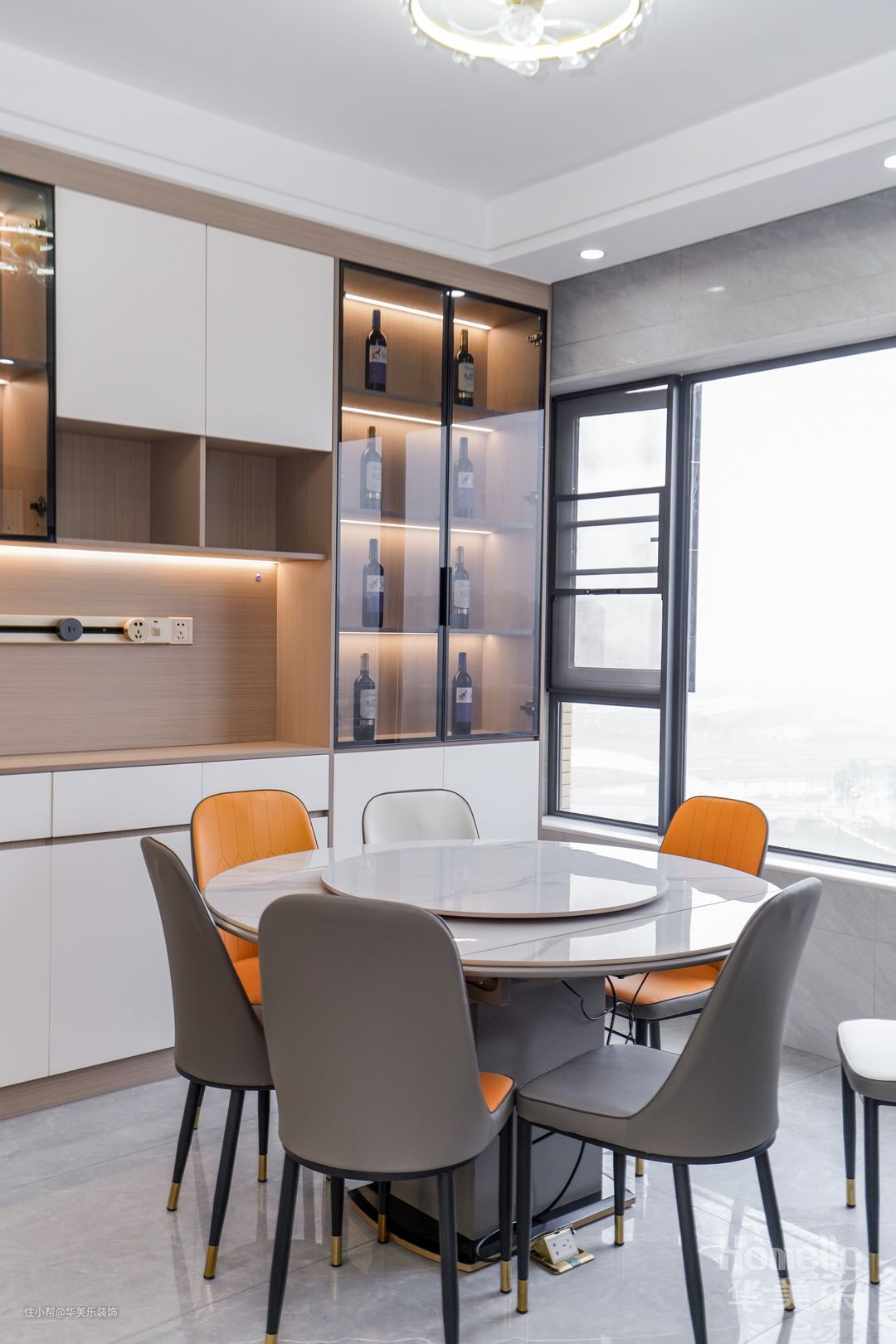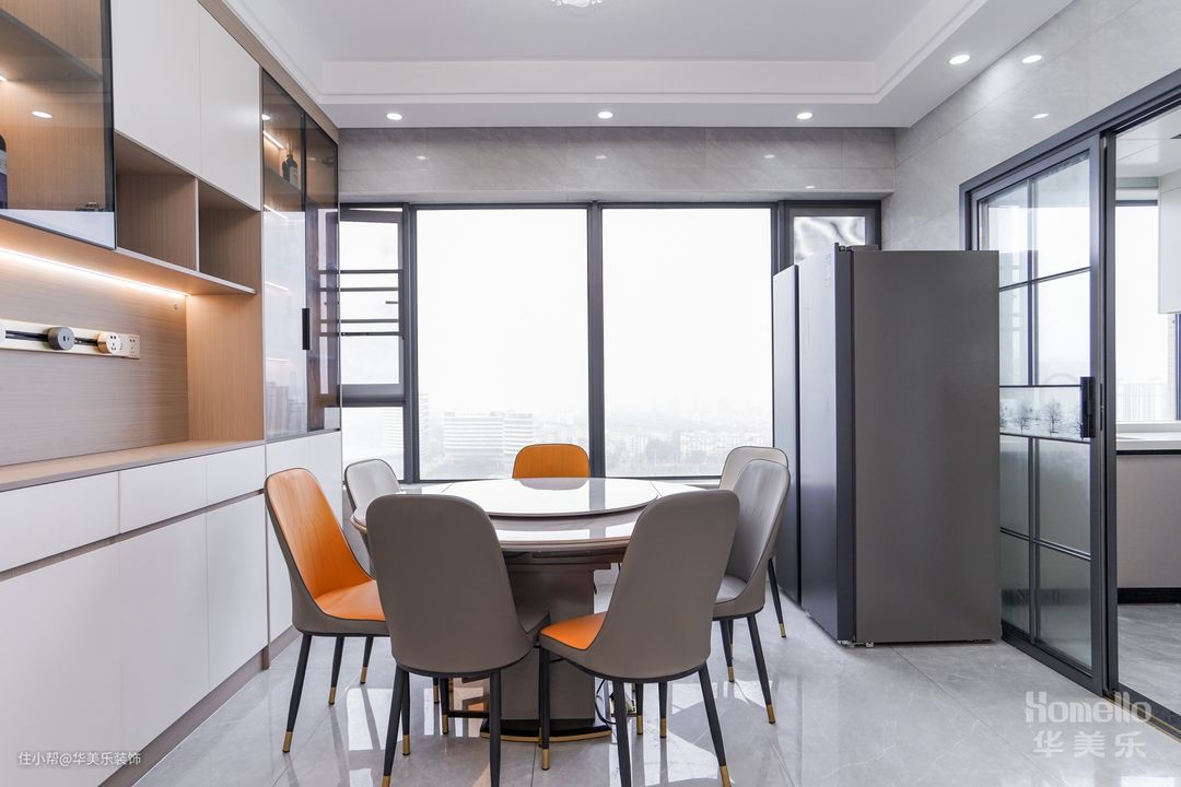 餐厅空间比较宽敞,因此选用岩板圆桌,一来外观大气上档次,二来能轻松应对多人聚餐的情况。餐桌本身的性价比也很高,硬度大,耐用度高,易清理都是其优点,餐桌上方摆放了岩板的转盘,进行一步优化就餐体验。