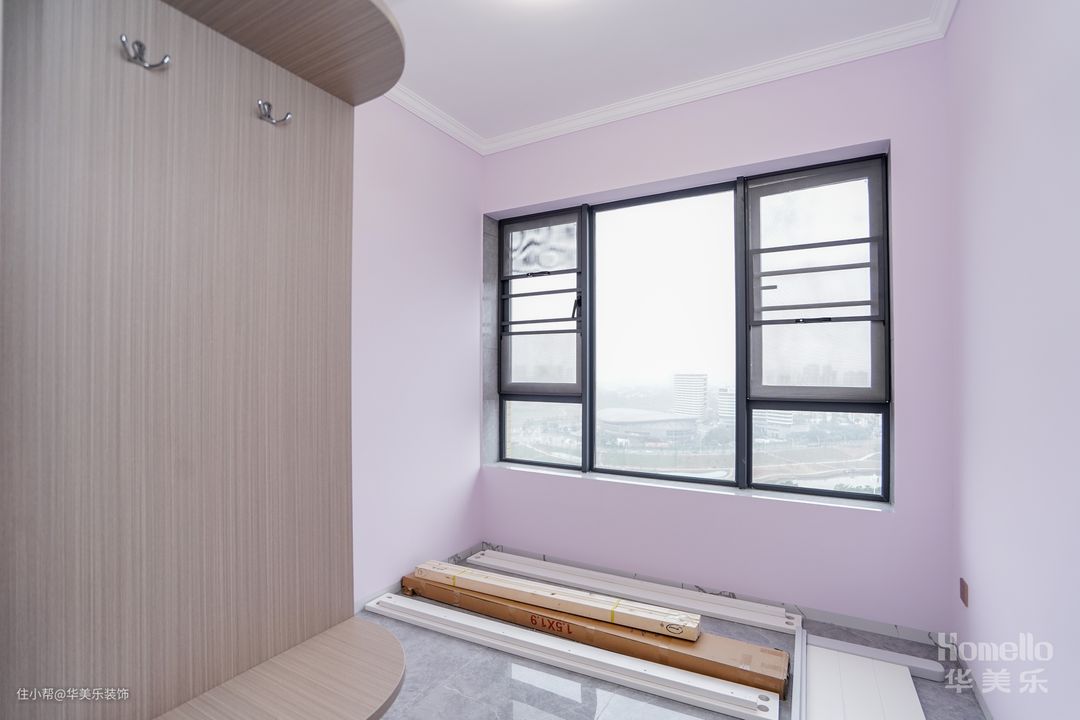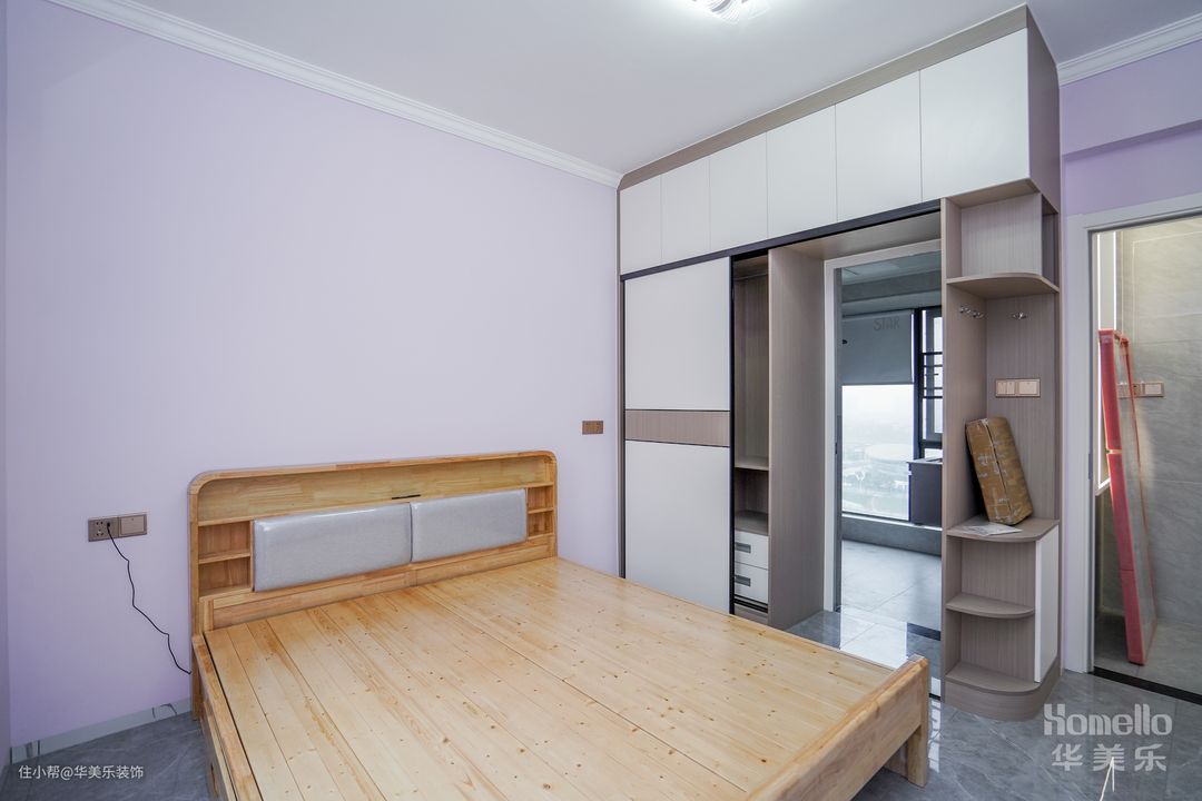 主卧设计延续着简约的设计理念,墙面刷了淡紫色的乳胶漆,属于耐看型,视觉效果很舒服。卧室取消了飘窗设计,让两侧过道空间保持宽敞。