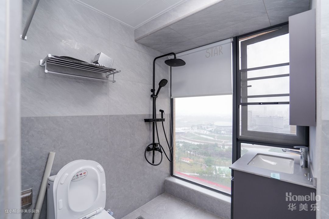 卫生间是一个修长的空间,内部没有进行干湿分离,让淋浴区能有更充足的使用空间,相对的卫生间的日常清洁工作也能方便一些。