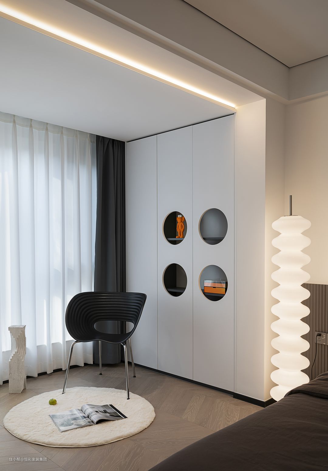 主卧是业主夫妻的休息区,主要结合业主需求增加一些设计点使其同时兼顾实用、美观。 通顶的门洞是极简风格常见的设计,通过黑色线条勾勒出门洞位置,简洁明了。 衣柜外定,白色区域凸出效果加分,转角区域置挂杆,用作当日衣物的放置,换取更方便,且不会造成衣物的随意堆放,影响整洁。 床头柜选择深色木板从衣柜处转角延伸,连同半高的格栅护墙,形成一个整体。护墙顶部嵌灯光带,装饰效果凸显。