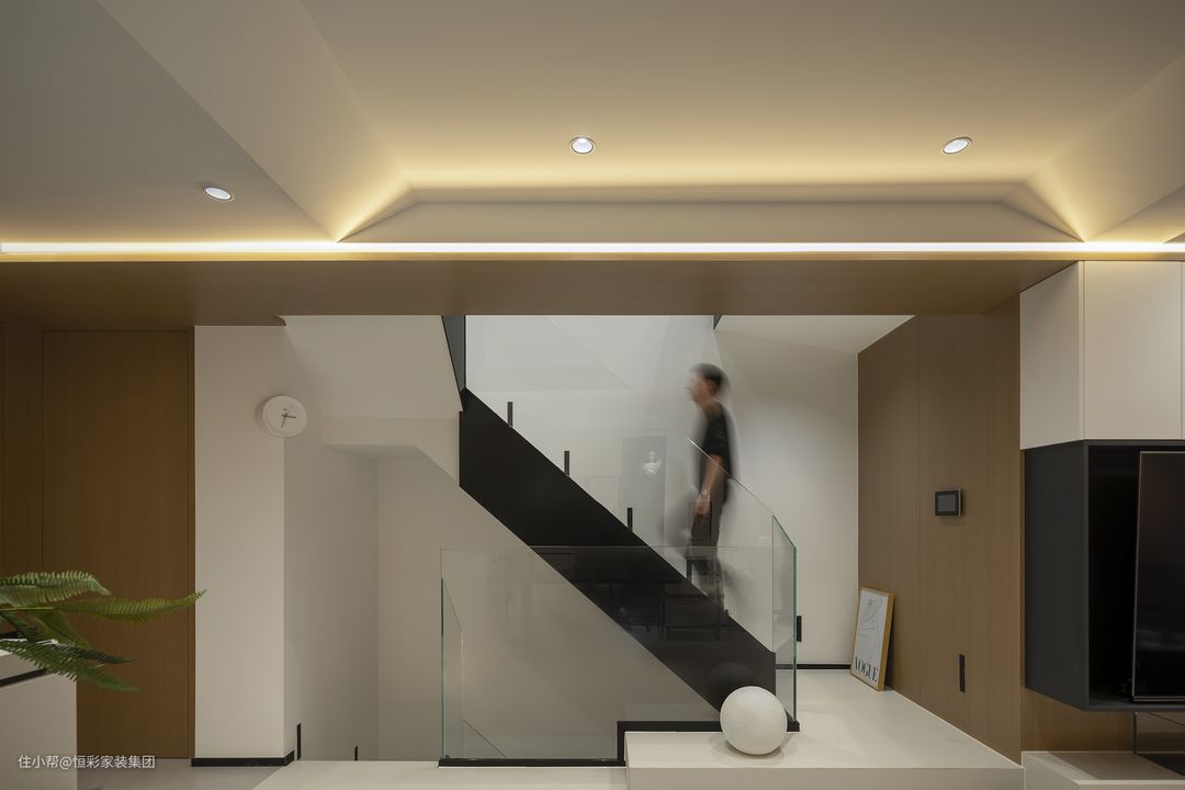 软装部分则有业主根据风格,参考设计师建议,自行选购的款式,黑白灰的主打色非常契合空间调性。 靠近用餐区的背景墙则设计木格栅纹理,配合灯光带的光效,带来视觉惊喜。 客厅与楼梯交接处有一道梁,设计师通过木饰面将两个空间做了衔接,同时原木调的木饰面也给人以温润的格调。单侧内嵌灯光带,为空间带了极佳的层次性。 地面选择一款灰调柔光砖做通铺处理,更有磅礴意味。