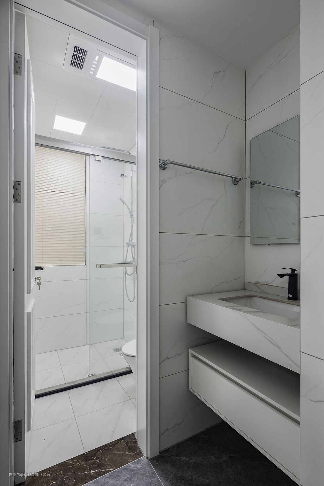 卫生间地砖利用视觉差丰富空间层次,立柱式洗手盆,将排水组件隐于无形,给人以干净整洁的外观感受,台盆高度根据家庭成员身高选择,使用更加方便舒适。 通透玻璃围合出淋浴区,避免淋浴时水花四溅,影响其他区域的使用,等晚上下班时便可以在这里冲个舒适的澡,以此来缓解一天的疲惫,在墙面上也设置了置物板,便于放置一些毛巾、浴球等小物件。